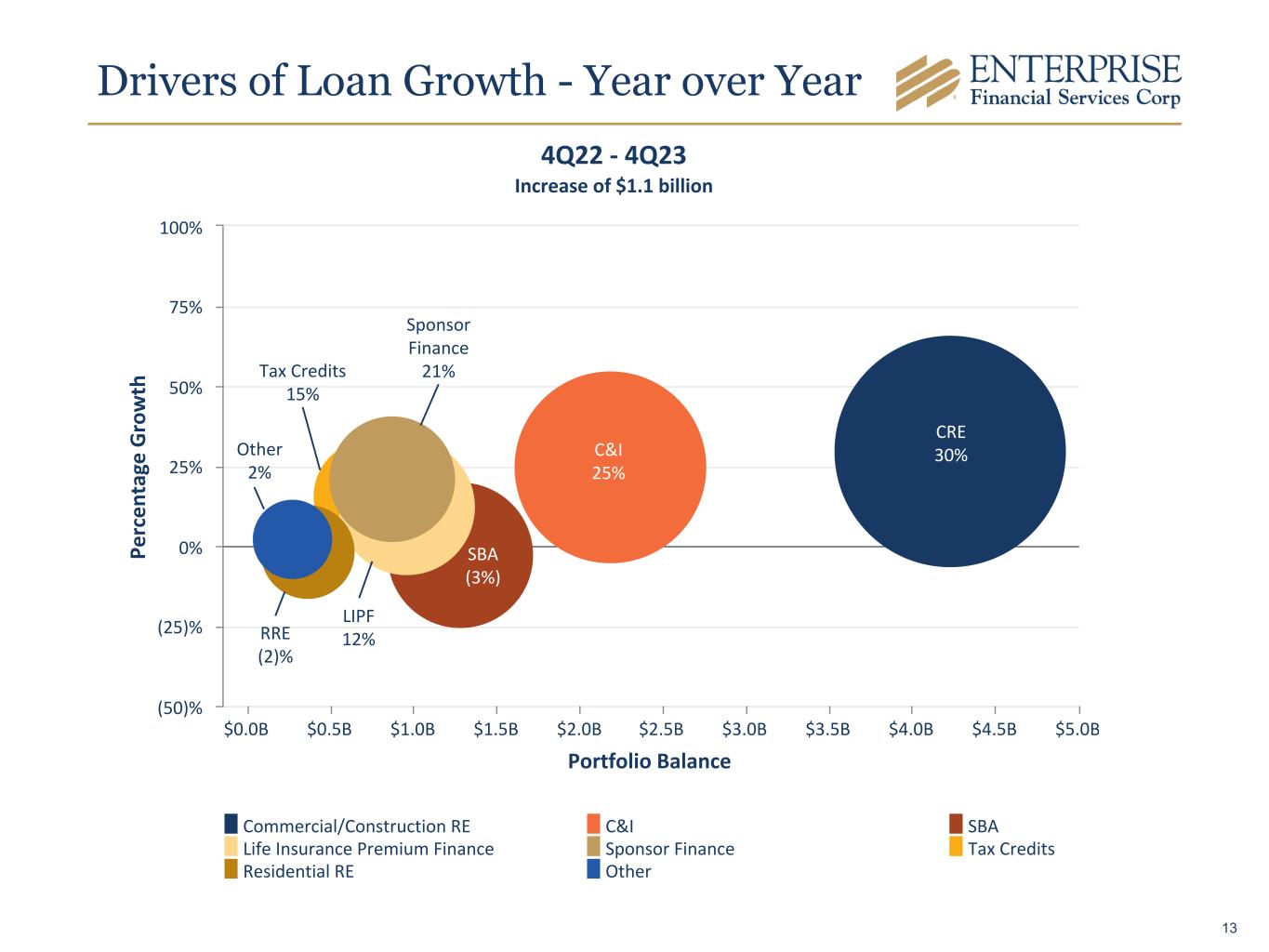 Portfolio Balance Pe rc en ta ge G ro w th $0.0B $0.5B $1.0B $1.5B $2.0B $2.5B $3.0B $3.5B $4.0B $4.5B $5.0B (50)% (25)% 0% 25% 50% 75% 100% CRE 30% Commercial/Construction RE C&I SBA Life Insurance Premium Finance Sponsor Finance Tax Credits Residential RE Other C&I 25% 4Q22 - 4Q23 Increase of $1.1 billion SBA (3%) LIPF 12% Tax Credits 15% RRE (2)% Sponsor Finance 21% Drivers of Loan Growth - Year over Year Other 2% 13