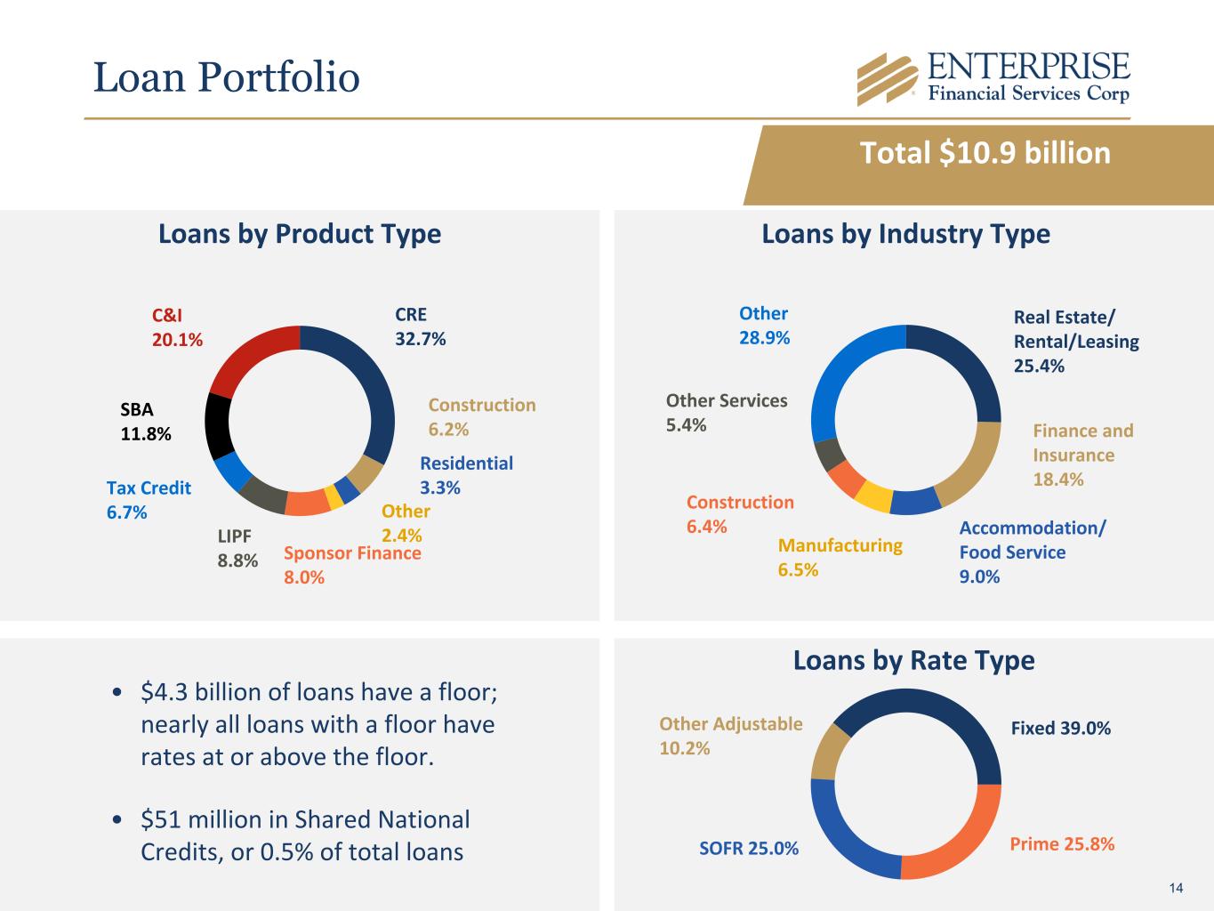 Total $10.9 billion Loans by Product Type Real Estate/ Rental/Leasing 25.4% Finance and Insurance 18.4% Accommodation/ Food Service 9.0% Manufacturing 6.5% Construction 6.4% Other Services 5.4% Other 28.9% Loans by Industry Type Fixed 39.0% Prime 25.8%SOFR 25.0% Other Adjustable 10.2% Loans by Rate Type • $4.3 billion of loans have a floor; nearly all loans with a floor have rates at or above the floor. • $51 million in Shared National Credits, or 0.5% of total loans Loan Portfolio CRE 32.7% Construction 6.2% Residential 3.3% Other 2.4% Sponsor Finance 8.0% LIPF 8.8% Tax Credit 6.7% SBA 11.8% C&I 20.1% 14