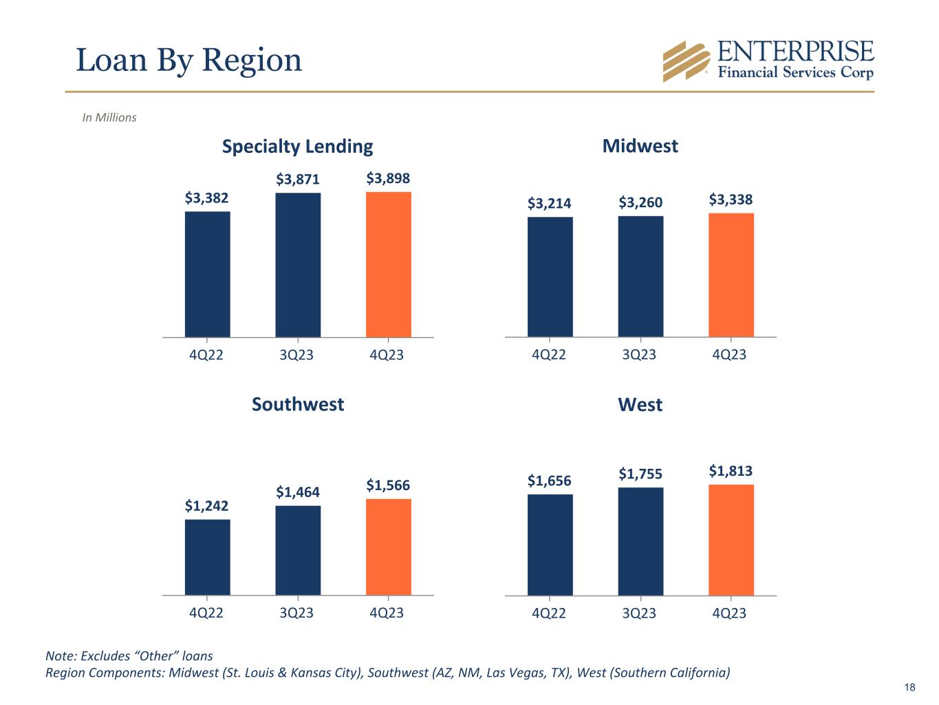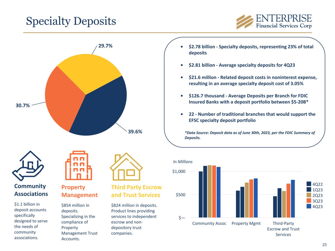 39.6% 30.7% 29.7% Community Associations $1.1 billion in deposit accounts specifically designed to serve the needs of community associations. Property Management $854 million in deposits. Specializing in the compliance of Property Management Trust Accounts. Third Party Escrow and Trust Services $824 million in deposits. Product lines providing services to independent escrow and non- depository trust companies. • $2.78 billion - Specialty deposits, representing 23% of total deposits • $2.81 billion - Average specialty deposits for 4Q23 • $21.6 million - Related deposit costs in noninterest expense, resulting in an average specialty deposit cost of 3.05% • $126.7 thousand - Average Deposits per Branch for FDIC Insured Banks with a deposit portfolio between $5-20B* • 22 - Number of traditional branches that would support the EFSC specialty deposit portfolio *Data Source: Deposit data as of June 30th, 2023, per the FDIC Summary of Deposits. 4Q22 1Q23 2Q23 3Q23 4Q23 Community Assoc Property Mgmt Third-Party Escrow and Trust Services $— $500 $1,000 In Millions Specialty Deposits 23