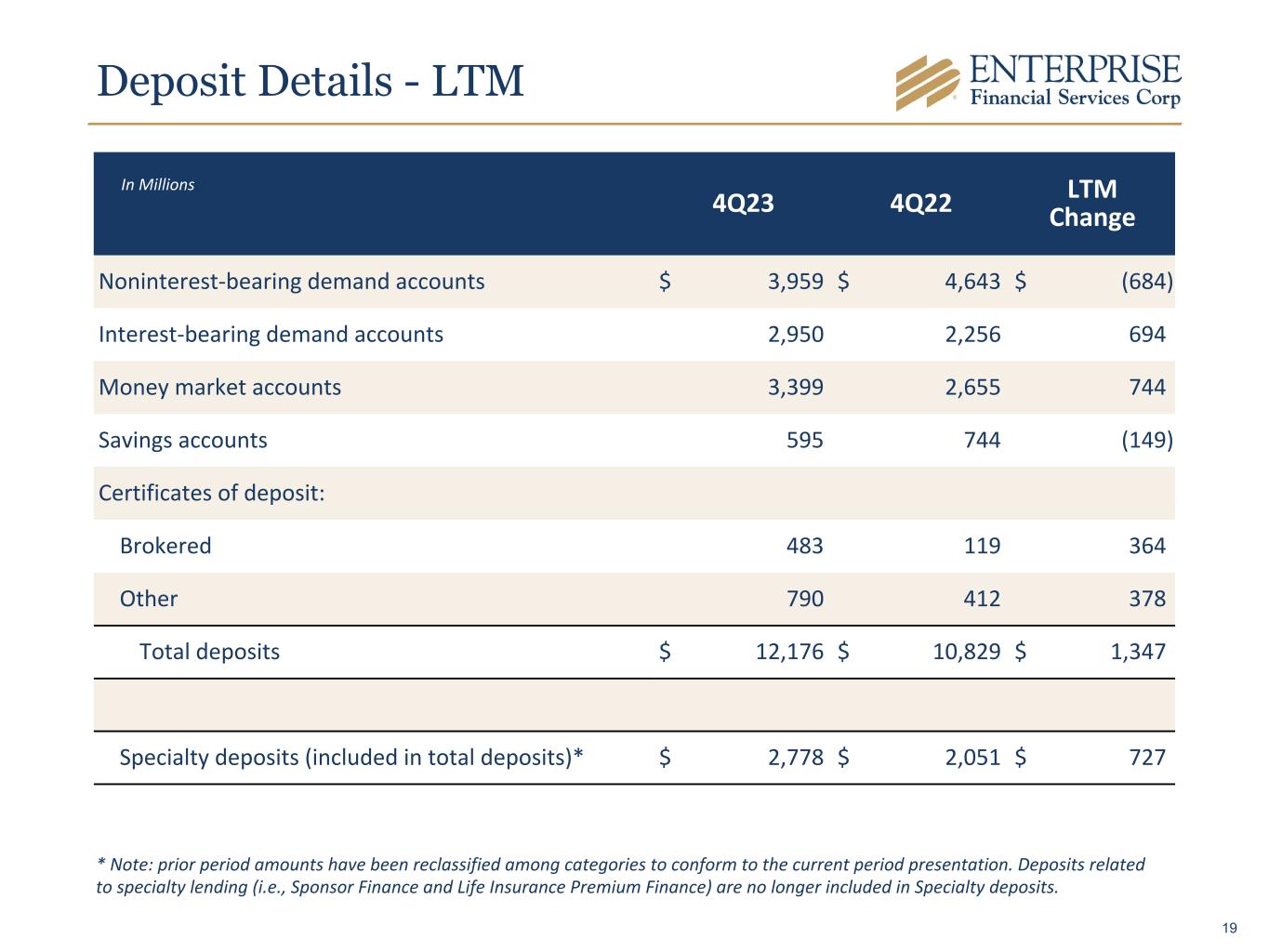 Deposit Details - LTM 4Q23 4Q22 LTM Change Noninterest-bearing demand accounts $ 3,959 $ 4,643 $ (684) Interest-bearing demand accounts 2,950 2,256 694 Money market accounts 3,399 2,655 744 Savings accounts 595 744 (149) Certificates of deposit: Brokered 483 119 364 Other 790 412 378 Total deposits $ 12,176 $ 10,829 $ 1,347 Specialty deposits (included in total deposits)* $ 2,778 $ 2,051 $ 727 In Millions * Note: prior period amounts have been reclassified among categories to conform to the current period presentation. Deposits related to specialty lending (i.e., Sponsor Finance and Life Insurance Premium Finance) are no longer included in Specialty deposits. 19