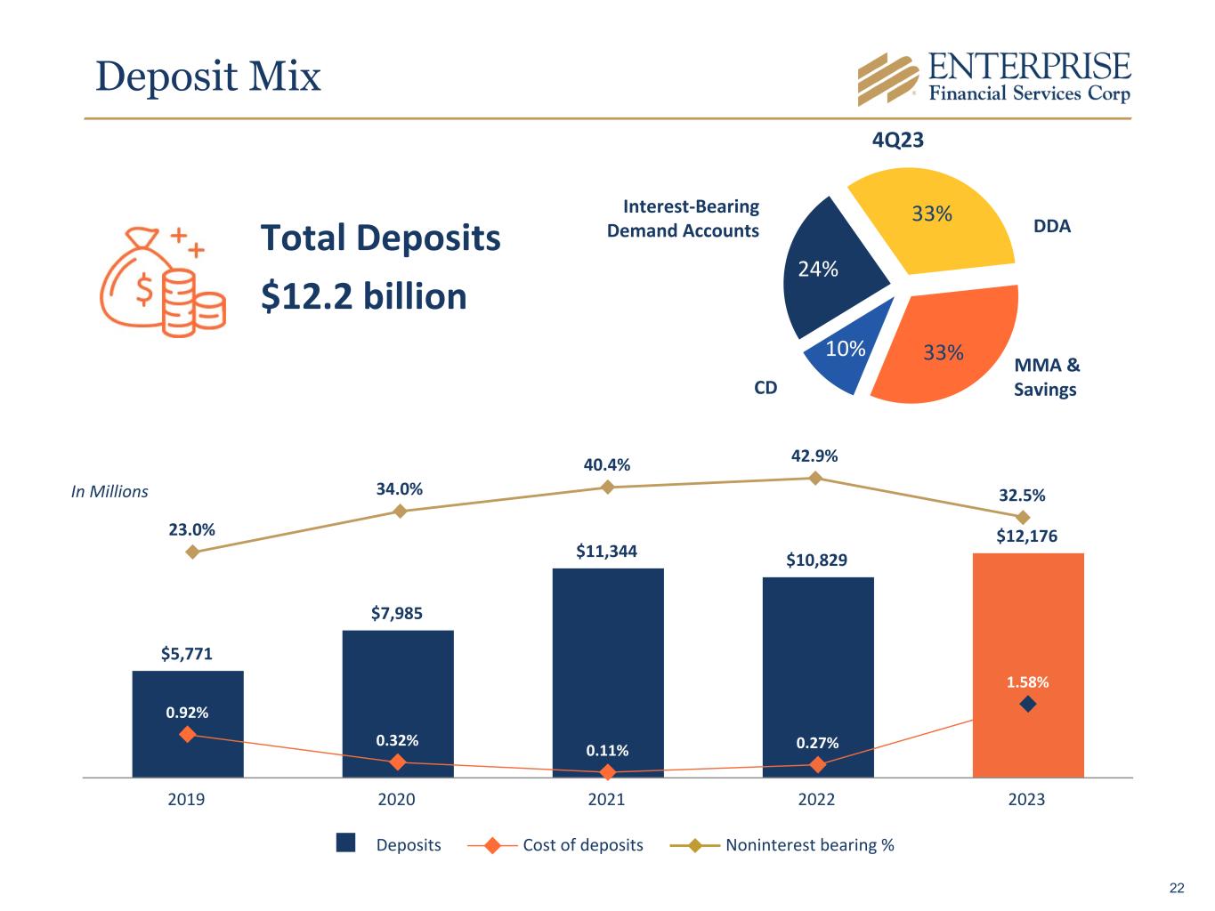 23.0% 34.0% 40.4% 42.9% 32.5% 33% 33%10% 24% $5,771 $7,985 $11,344 $10,829 $12,176 0.92% 0.32% 0.11% 0.27% 1.58% Deposits Cost of deposits Noninterest bearing % 2019 2020 2021 2022 2023 CD Interest-Bearing Demand Accounts DDA MMA & Savings In Millions Total Deposits $12.2 billion 4Q23 Deposit Mix 22