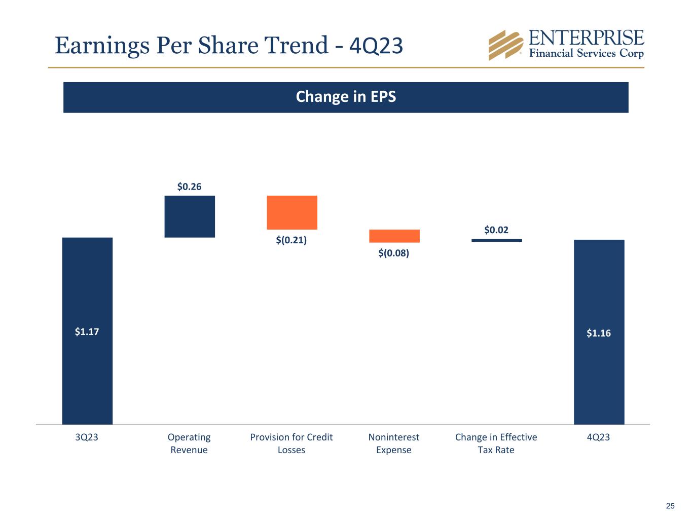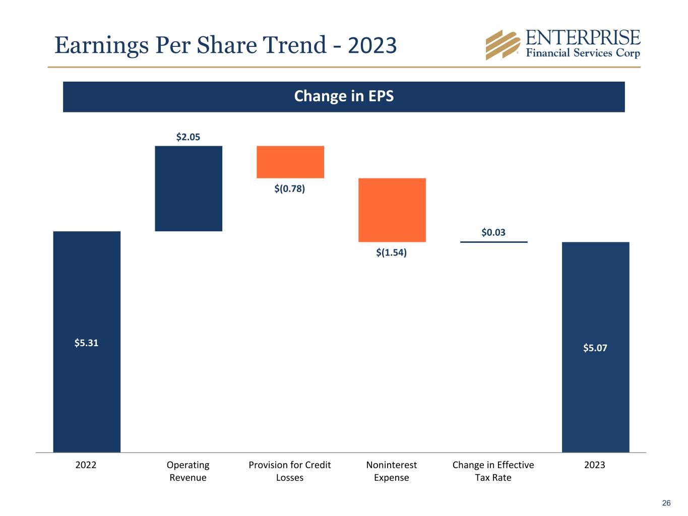 Earnings Per Share Trend - 4Q23 $1.17 $0.26 $(0.21) $(0.08) $0.02 $1.16 3Q23 Operating Revenue Provision for Credit Losses Noninterest Expense Change in Effective Tax Rate 4Q23 Change in EPS 25