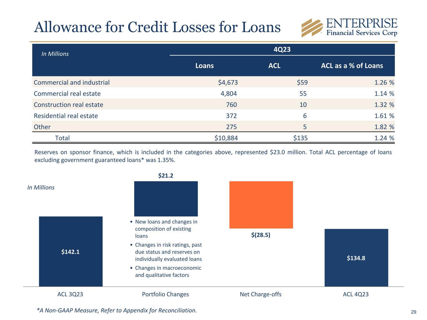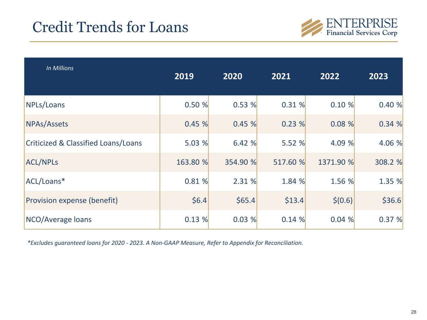 Credit Trends for Loans 2019 2020 2021 2022 2023 NPLs/Loans 0.50 % 0.53 % 0.31 % 0.10 % 0.40 % NPAs/Assets 0.45 % 0.45 % 0.23 % 0.08 % 0.34 % Criticized & Classified Loans/Loans 5.03 % 6.42 % 5.52 % 4.09 % 4.06 % ACL/NPLs 163.80 % 354.90 % 517.60 % 1371.90 % 308.2 % ACL/Loans* 0.81 % 2.31 % 1.84 % 1.56 % 1.35 % Provision expense (benefit) $6.4 $65.4 $13.4 $(0.6) $36.6 NCO/Average loans 0.13 % 0.03 % 0.14 % 0.04 % 0.37 % *Excludes guaranteed loans for 2020 - 2023. A Non-GAAP Measure, Refer to Appendix for Reconciliation. In Millions 28