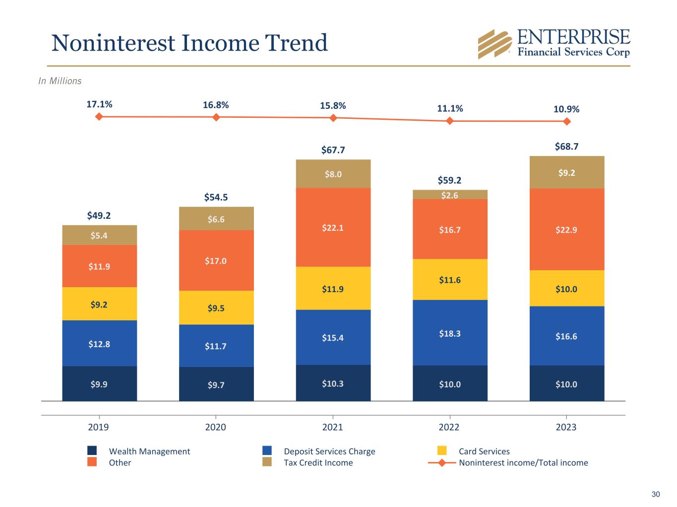 Noninterest Income Trend In Millions $49.2 $54.5 $67.7 $59.2 $68.7 $9.9 $9.7 $10.3 $10.0 $10.0 $12.8 $11.7 $15.4 $18.3 $16.6 $9.2 $9.5 $11.9 $11.6 $10.0 $11.9 $17.0 $22.1 $16.7 $22.9 $5.4 $6.6 $8.0 $2.6 $9.2 17.1% 16.8% 15.8% 11.1% 10.9% Wealth Management Deposit Services Charge Card Services Other Tax Credit Income Noninterest income/Total income 2019 2020 2021 2022 2023 30