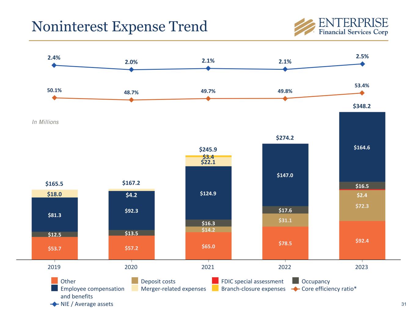 Noninterest Expense Trend In Millions $165.5 $167.2 $245.9 $274.2 $348.2 $53.7 $57.2 $65.0 $78.5 $92.4 $14.2 $31.1 $72.3 $2.4 $12.5 $13.5 $16.3 $17.6 $16.5 $81.3 $92.3 $124.9 $147.0 $164.6 $18.0 $4.2 $22.1 $3.4 50.1% 48.7% 49.7% 49.8% 53.4% Other Deposit costs FDIC special assessment Occupancy Employee compensation and benefits Merger-related expenses Branch-closure expenses Core efficiency ratio* NIE / Average assets 2019 2020 2021 2022 2023 2.4% 2.0% 2.1% 2.1% 2.5% 31