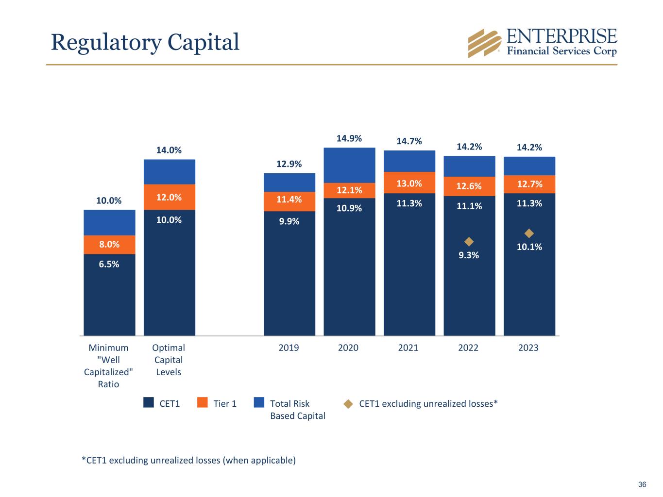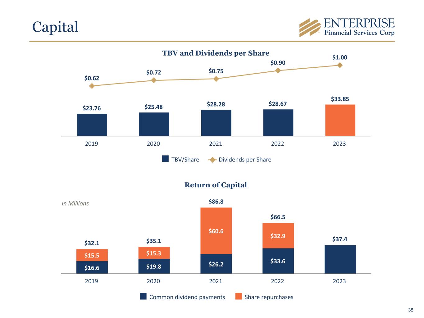 Capital TBV and Dividends per Share $23.76 $25.48 $28.28 $28.67 $33.85 $0.62 $0.72 $0.75 $0.90 $1.00 TBV/Share Dividends per Share 2019 2020 2021 2022 2023 Return of Capital $32.1 $35.1 $86.8 $66.5 $37.4 $16.6 $19.8 $26.2 $33.6 $15.5 $15.3 $60.6 $32.9 Common dividend payments Share repurchases 2019 2020 2021 2022 2023 In Millions 35