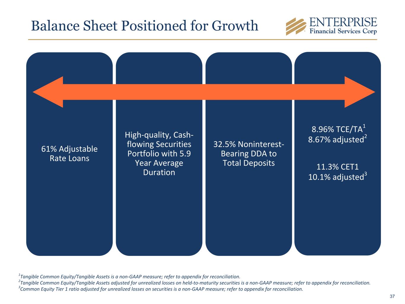 61% Adjustable Rate Loans High-quality, Cash- flowing Securities Portfolio with 5.9 Year Average Duration 32.5% Noninterest- Bearing DDA to Total Deposits 8.96% TCE/TA1 8.67% adjusted2 11.3% CET1 10.1% adjusted3 Balance Sheet Positioned for Growth 1Tangible Common Equity/Tangible Assets is a non-GAAP measure; refer to appendix for reconciliation. 2Tangible Common Equity/Tangible Assets adjusted for unrealized losses on held-to-maturity securities is a non-GAAP measure; refer to appendix for reconciliation. 3Common Equity Tier 1 ratio adjusted for unrealized losses on securities is a non-GAAP measure; refer to appendix for reconciliation. 37