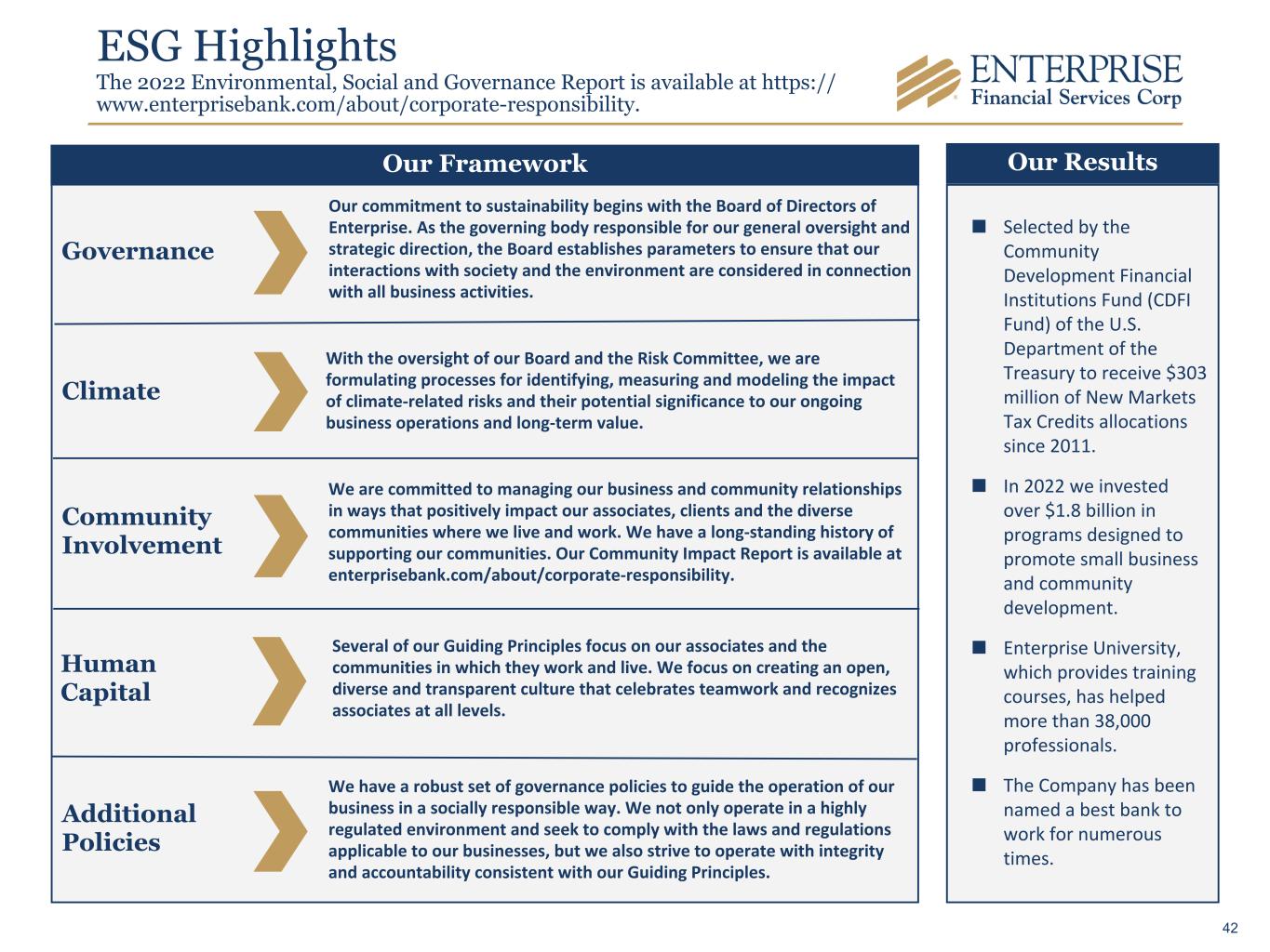 ■ Selected by the Community Development Financial Institutions Fund (CDFI Fund) of the U.S. Department of the Treasury to receive $303 million of New Markets Tax Credits allocations since 2011. ■ In 2022 we invested over $1.8 billion in programs designed to promote small business and community development. ■ Enterprise University, which provides training courses, has helped more than 38,000 professionals. ■ The Company has been named a best bank to work for numerous times. ESG Highlights The 2022 Environmental, Social and Governance Report is available at https:// www.enterprisebank.com/about/corporate-responsibility. Our Framework Additional Policies We have a robust set of governance policies to guide the operation of our business in a socially responsible way. We not only operate in a highly regulated environment and seek to comply with the laws and regulations applicable to our businesses, but we also strive to operate with integrity and accountability consistent with our Guiding Principles. Our commitment to sustainability begins with the Board of Directors of Enterprise. As the governing body responsible for our general oversight and strategic direction, the Board establishes parameters to ensure that our interactions with society and the environment are considered in connection with all business activities. Governance Climate With the oversight of our Board and the Risk Committee, we are formulating processes for identifying, measuring and modeling the impact of climate-related risks and their potential significance to our ongoing business operations and long-term value. Community Involvement We are committed to managing our business and community relationships in ways that positively impact our associates, clients and the diverse communities where we live and work. We have a long-standing history of supporting our communities. Our Community Impact Report is available at enterprisebank.com/about/corporate-responsibility. Human Capital Several of our Guiding Principles focus on our associates and the communities in which they work and live. We focus on creating an open, diverse and transparent culture that celebrates teamwork and recognizes associates at all levels. Our Results 42