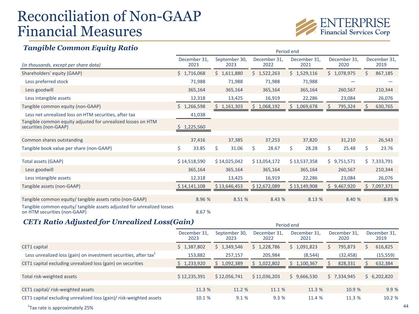 Reconciliation of Non-GAAP Financial Measures Period end (in thousands, except per share data) December 31, 2023 September 30, 2023 December 31, 2022 December 31, 2021 December 31, 2020 December 31, 2019 Shareholders' equity (GAAP) $ 1,716,068 $ 1,611,880 $ 1,522,263 $ 1,529,116 $ 1,078,975 $ 867,185 Less preferred stock 71,988 71,988 71,988 71,988 — — Less goodwill 365,164 365,164 365,164 365,164 260,567 210,344 Less intangible assets 12,318 13,425 16,919 22,286 23,084 26,076 Tangible common equity (non-GAAP) $ 1,266,598 $ 1,161,303 $ 1,068,192 $ 1,069,678 $ 795,324 $ 630,765 Less net unrealized loss on HTM securities, after tax 41,038 Tangible common equity adjusted for unrealized losses on HTM securities (non-GAAP) $ 1,225,560 Common shares outstanding 37,416 37,385 37,253 37,820 31,210 26,543 Tangible book value per share (non-GAAP) $ 33.85 $ 31.06 $ 28.67 $ 28.28 $ 25.48 $ 23.76 Total assets (GAAP) $ 14,518,590 $ 14,025,042 $ 13,054,172 $ 13,537,358 $ 9,751,571 $ 7,333,791 Less goodwill 365,164 365,164 365,164 365,164 260,567 210,344 Less intangible assets 12,318 13,425 16,919 22,286 23,084 26,076 Tangible assets (non-GAAP) $ 14,141,108 $ 13,646,453 $ 12,672,089 $ 13,149,908 $ 9,467,920 $ 7,097,371 Tangible common equity/ tangible assets ratio (non-GAAP) 8.96 % 8.51 % 8.43 % 8.13 % 8.40 % 8.89 % Tangible common equity/ tangible assets adjusted for unrealized losses on HTM securities (non-GAAP) 8.67 % Period end December 31, 2023 September 30, 2023 December 31, 2022 December 31, 2021 December 31, 2020 December 31, 2019 CET1 capital $ 1,387,802 $ 1,349,546 $ 1,228,786 $ 1,091,823 $ 795,873 $ 616,825 Less unrealized loss (gain) on investment securities, after tax1 153,882 257,157 205,984 (8,544) (32,458) (15,559) CET1 capital excluding unrealized loss (gain) on securities $ 1,233,920 $ 1,092,389 $ 1,022,802 $ 1,100,367 $ 828,331 $ 632,384 Total risk-weighted assets $ 12,235,391 $ 12,056,741 $ 11,036,203 $ 9,666,530 $ 7,334,945 $ 6,202,820 CET1 capital/ risk-weighted assets 11.3 % 11.2 % 11.1 % 11.3 % 10.9 % 9.9 % CET1 capital excluding unrealized loss (gain)/ risk-weighted assets 10.1 % 9.1 % 9.3 % 11.4 % 11.3 % 10.2 % Tangible Common Equity Ratio 1Tax rate is approximately 25% CET1 Ratio Adjusted for Unrealized Loss(Gain) 44