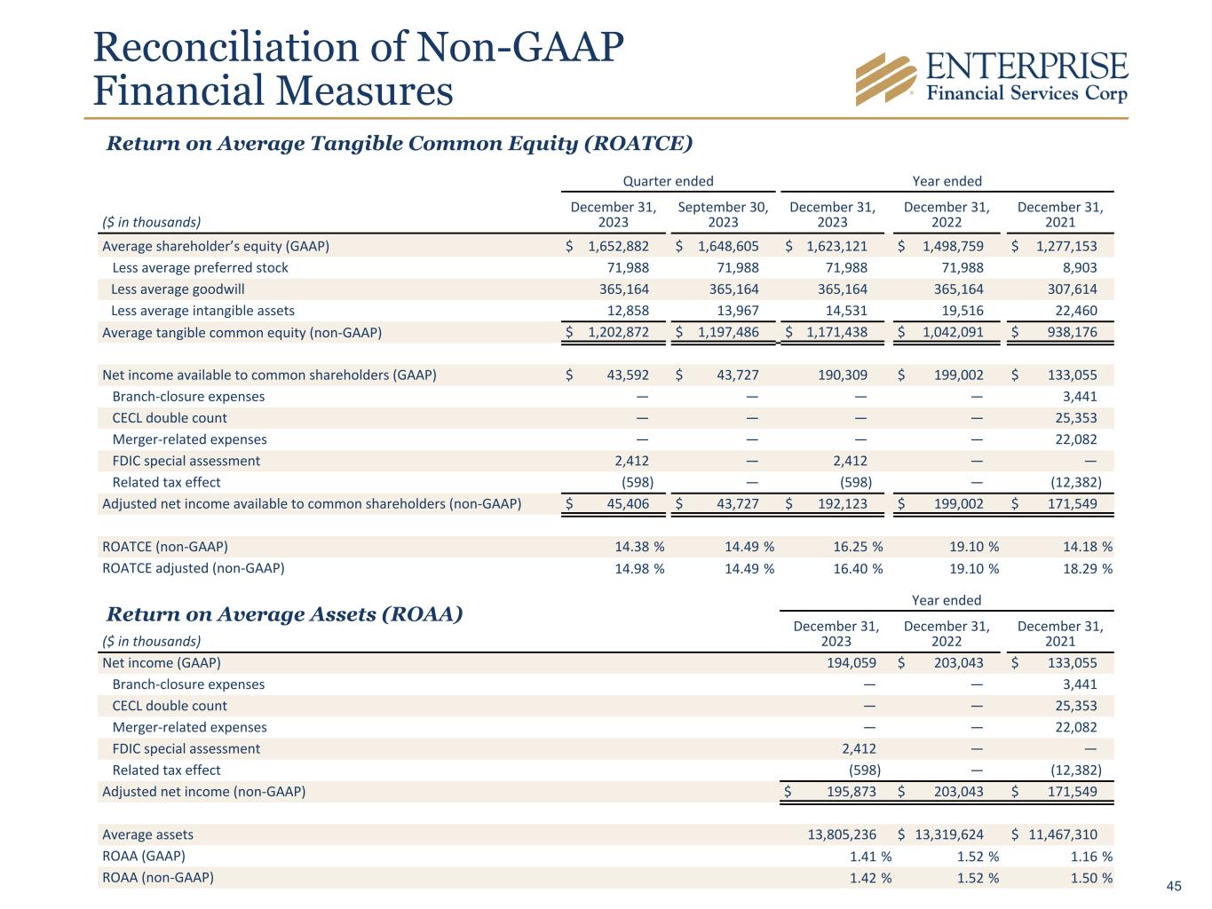 Quarter ended Year ended ($ in thousands) December 31, 2023 September 30, 2023 December 31, 2023 December 31, 2022 December 31, 2021 Average shareholder’s equity (GAAP) $ 1,652,882 $ 1,648,605 $ 1,623,121 $ 1,498,759 $ 1,277,153 Less average preferred stock 71,988 71,988 71,988 71,988 8,903 Less average goodwill 365,164 365,164 365,164 365,164 307,614 Less average intangible assets 12,858 13,967 14,531 19,516 22,460 Average tangible common equity (non-GAAP) $ 1,202,872 $ 1,197,486 $ 1,171,438 $ 1,042,091 $ 938,176 Net income available to common shareholders (GAAP) $ 43,592 $ 43,727 190,309 $ 199,002 $ 133,055 Branch-closure expenses — — — — 3,441 CECL double count — — — — 25,353 Merger-related expenses — — — — 22,082 FDIC special assessment 2,412 — 2,412 — — Related tax effect (598) — (598) — (12,382) Adjusted net income available to common shareholders (non-GAAP) $ 45,406 $ 43,727 $ 192,123 $ 199,002 $ 171,549 ROATCE (non-GAAP) 14.38 % 14.49 % 16.25 % 19.10 % 14.18 % ROATCE adjusted (non-GAAP) 14.98 % 14.49 % 16.40 % 19.10 % 18.29 % Reconciliation of Non-GAAP Financial Measures Return on Average Tangible Common Equity (ROATCE) Year ended ($ in thousands) December 31, 2023 December 31, 2022 December 31, 2021 Net income (GAAP) 194,059 $ 203,043 $ 133,055 Branch-closure expenses — — 3,441 CECL double count — — 25,353 Merger-related expenses — — 22,082 FDIC special assessment 2,412 — — Related tax effect (598) — (12,382) Adjusted net income (non-GAAP) $ 195,873 $ 203,043 $ 171,549 Average assets 13,805,236 $ 13,319,624 $ 11,467,310 ROAA (GAAP) 1.41 % 1.52 % 1.16 % ROAA (non-GAAP) 1.42 % 1.52 % 1.50 % Return on Average Assets (ROAA) 45