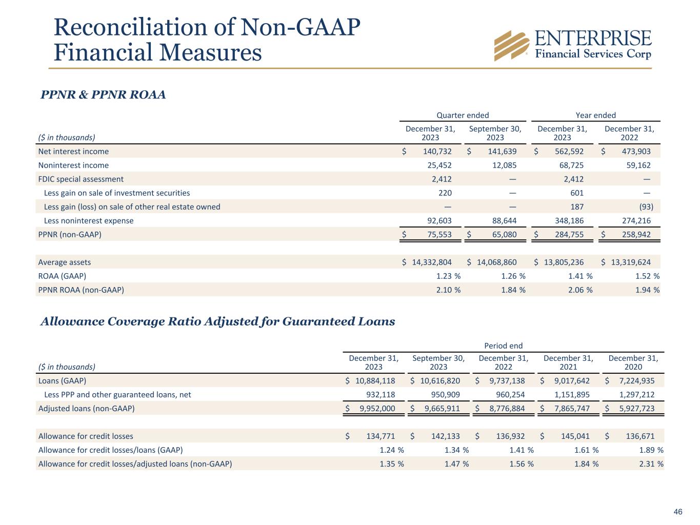 Reconciliation of Non-GAAP Financial Measures Quarter ended Year ended ($ in thousands) December 31, 2023 September 30, 2023 December 31, 2023 December 31, 2022 Net interest income $ 140,732 $ 141,639 $ 562,592 $ 473,903 Noninterest income 25,452 12,085 68,725 59,162 FDIC special assessment 2,412 — 2,412 — Less gain on sale of investment securities 220 — 601 — Less gain (loss) on sale of other real estate owned — — 187 (93) Less noninterest expense 92,603 88,644 348,186 274,216 PPNR (non-GAAP) $ 75,553 $ 65,080 $ 284,755 $ 258,942 Average assets $ 14,332,804 $ 14,068,860 $ 13,805,236 $ 13,319,624 ROAA (GAAP) 1.23 % 1.26 % 1.41 % 1.52 % PPNR ROAA (non-GAAP) 2.10 % 1.84 % 2.06 % 1.94 % PPNR & PPNR ROAA Allowance Coverage Ratio Adjusted for Guaranteed Loans Period end ($ in thousands) December 31, 2023 September 30, 2023 December 31, 2022 December 31, 2021 December 31, 2020 Loans (GAAP) $ 10,884,118 $ 10,616,820 $ 9,737,138 $ 9,017,642 $ 7,224,935 Less PPP and other guaranteed loans, net 932,118 950,909 960,254 1,151,895 1,297,212 Adjusted loans (non-GAAP) $ 9,952,000 $ 9,665,911 $ 8,776,884 $ 7,865,747 $ 5,927,723 Allowance for credit losses $ 134,771 $ 142,133 $ 136,932 $ 145,041 $ 136,671 Allowance for credit losses/loans (GAAP) 1.24 % 1.34 % 1.41 % 1.61 % 1.89 % Allowance for credit losses/adjusted loans (non-GAAP) 1.35 % 1.47 % 1.56 % 1.84 % 2.31 % 46