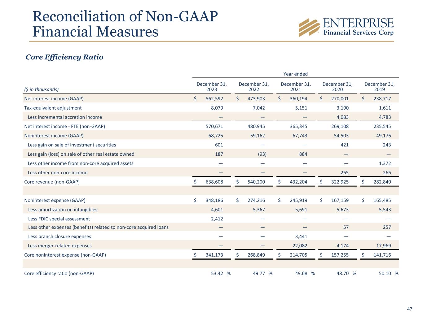 Reconciliation of Non-GAAP Financial Measures Year ended ($ in thousands) December 31, 2023 December 31, 2022 December 31, 2021 December 31, 2020 December 31, 2019 Net interest income (GAAP) $ 562,592 $ 473,903 $ 360,194 $ 270,001 $ 238,717 Tax-equivalent adjustment 8,079 7,042 5,151 3,190 1,611 Less incremental accretion income — — — 4,083 4,783 Net interest income - FTE (non-GAAP) 570,671 480,945 365,345 269,108 235,545 Noninterest income (GAAP) 68,725 59,162 67,743 54,503 49,176 Less gain on sale of investment securities 601 — — 421 243 Less gain (loss) on sale of other real estate owned 187 (93) 884 — — Less other income from non-core acquired assets — — — — 1,372 Less other non-core income — — — 265 266 Core revenue (non-GAAP) $ 638,608 $ 540,200 $ 432,204 $ 322,925 $ 282,840 Noninterest expense (GAAP) $ 348,186 $ 274,216 $ 245,919 $ 167,159 $ 165,485 Less amortization on intangibles 4,601 5,367 5,691 5,673 5,543 Less FDIC special assessment 2,412 — — — — Less other expenses (benefits) related to non-core acquired loans — — — 57 257 Less branch closure expenses — — 3,441 — — Less merger-related expenses — — 22,082 4,174 17,969 Core noninterest expense (non-GAAP) $ 341,173 $ 268,849 $ 214,705 $ 157,255 $ 141,716 Core efficiency ratio (non-GAAP) 53.42 % 49.77 % 49.68 % 48.70 % 50.10 % Core Efficiency Ratio 47