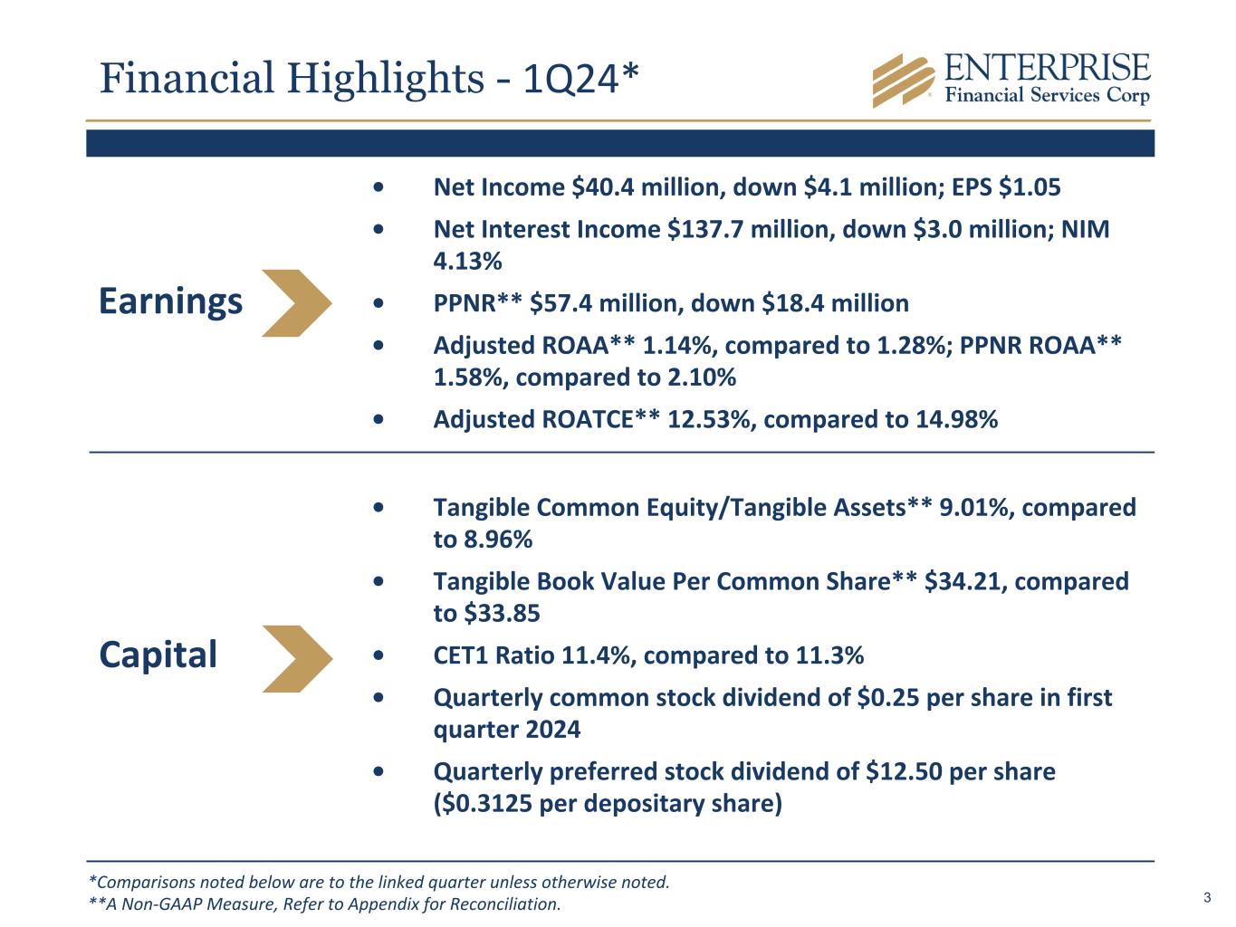 Forward-Looking Statements Some of the information in this report may contain “forward-looking statements” within the meaning of and intended to be covered by the safe harbor provisions of the Private Securities Litigation Reform Act of 1995. Such forward-looking statements may include projections based on management’s current expectations and beliefs concerning future developments and their potential effects on the Company including, without limitation, plans, strategies and goals, and statements about the Company’s expectations regarding revenue and asset growth, financial performance and profitability, loan and deposit growth, liquidity, yields and returns, loan diversification and credit management, shareholder value creation and the impact of acquisitions. Forward-looking statements are typically identified by words such as “believe,” “expect,” “anticipate,” “intend,” “outlook,” “estimate,” “forecast,” “project,” “pro forma,” “pipeline” and other similar words and expressions. Forward-looking statements are subject to numerous assumptions, risks and uncertainties, which change over time. Forward-looking statements speak only as of the date they are made. Because forward-looking statements are subject to assumptions and uncertainties, actual results or future events could differ, possibly materially, from those anticipated in the forward-looking statements and future results could differ materially from historical performance. They are neither statements of historical fact nor guarantees or assurances of future performance. While there is no assurance that any list of risks and uncertainties or risk factors is complete, important factors that could cause actual results to differ materially from those in the forward-looking statements include the following, without limitation: our ability to efficiently integrate acquisitions into our operations, retain the customers of these businesses and grow the acquired operations; credit risk; changes in the appraised valuation of real estate securing impaired loans; our ability to recover our investment in loans; fluctuations in the fair value of collateral underlying loans; outcomes of litigation and other contingencies; exposure to general and local economic and market conditions, including risk of recession, high unemployment rates, higher inflation and its impacts (including U.S. federal government measures to address higher inflation), U.S. fiscal debt, budget and tax matters, and any slowdown in global economic growth; risks associated with rapid increases or decreases in prevailing interest rates; changes in business prospects that could impact goodwill estimates and assumptions; consolidation within the banking industry; competition from banks and other financial institutions; the ability to attract and retain relationship officers and other key personnel; burdens imposed by federal and state regulation; changes in legislative or regulatory requirements, as well as current, pending or future legislation or regulation that could have a negative effect on our revenue and business, including rules and regulations relating to bank products and financial services; changes in accounting policies and practices or accounting standards; natural disasters; terrorist activities, war and geopolitical matters (including the war in Israel and potential for a broader regional conflict and the war in Ukraine and the imposition of additional sanctions and export controls in connection therewith), or pandemics, or other health emergencies and their effects on economic and business environments in which we operate, including the related disruption to the financial market and other economic activity; and other risks referenced from time to time in the Company’s filings with the Securities and Exchange Commission (the “SEC”), including in the Company’s Annual Report on Form 10-K for the fiscal year ended December 31, 2023, and the Company’s other filings with the SEC. The Company cautions that the preceding list is not exhaustive of all possible risk factors and other factors could also adversely affect the Company’s results. For any forward-looking statements made in this press release or in any documents, EFSC claims the protection of the safe harbor for forward-looking statements contained in the Private Securities Litigation Reform Act of 1995. Annualized, pro forma, projected and estimated numbers in this document are used for illustrative purposes only, are not forecasts and may not reflect actual results. Readers are cautioned not to place undue reliance on any forward-looking statements. Except to the extent required by applicable law or regulation, EFSC disclaims any obligation to revise or publicly release any revision or update to any of the forward-looking statements included herein to reflect events or circumstances that occur after the date on which such statements were made. 2