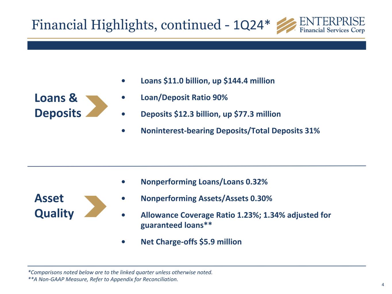 Financial Highlights, continued - 1Q24* *Comparisons noted below are to the linked quarter unless otherwise noted. **A Non-GAAP Measure, Refer to Appendix for Reconciliation. Loans & Deposits • Loans $11.0 billion, up $144.4 million • Loan/Deposit Ratio 90% • Deposits $12.3 billion, up $77.3 million • Noninterest-bearing Deposits/Total Deposits 31% Asset Quality • Nonperforming Loans/Loans 0.32% • Nonperforming Assets/Assets 0.30% • Allowance Coverage Ratio 1.23%; 1.34% adjusted for guaranteed loans** • Net Charge-offs $5.9 million 4