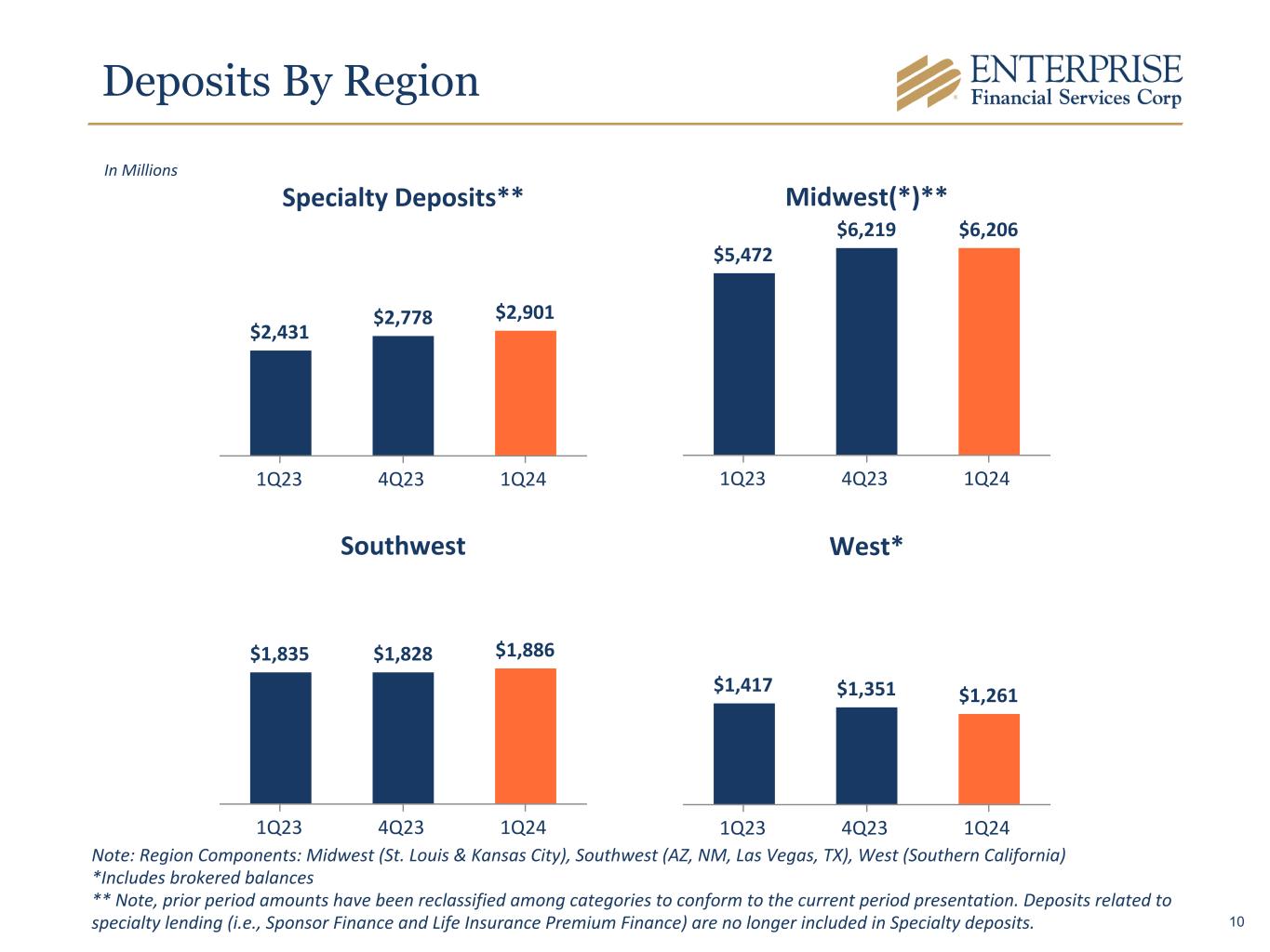 Deposit Details 1Q24 4Q23 1Q23 Qtr Change LTM Change Noninterest-bearing demand accounts $ 3,805 $ 3,959 $ 4,192 $ (154) $ (387) Interest-bearing demand accounts 2,956 2,950 2,396 6 560 Money market accounts 3,431 3,399 2,960 32 471 Savings accounts 576 595 713 (19) (137) Certificates of deposit: Brokered 659 483 370 176 289 Customer 827 790 524 37 303 Total Deposits $ 12,254 $ 12,176 $ 11,155 $ 78 $ 1,099 Specialty Deposits (included in total deposits)** $ 2,901 $ 2,778 $ 2,431 $ 123 $ 470 In Millions * Total deposits excluding specialty and brokered CDs decreased $221 million from 4Q23 and increased $340 million from 1Q23 ** Note: 1Q23 amounts have been reclassified among categories to conform to the current period presentation. Deposits related to specialty lending (i.e., Sponsor Finance and Life Insurance Premium Finance) are no longer included in Specialty deposits. * 9