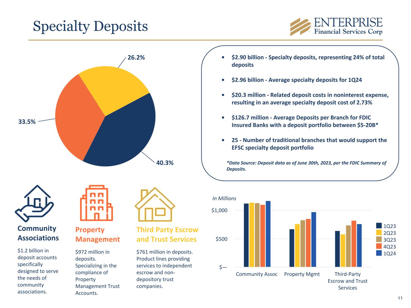 Deposits By Region Specialty Deposits** $2,431 $2,778 $2,901 1Q23 4Q23 1Q24 In Millions Midwest(*)** $5,472 $6,219 $6,206 1Q23 4Q23 1Q24 Southwest $1,835 $1,828 $1,886 1Q23 4Q23 1Q24 West* $1,417 $1,351 $1,261 1Q23 4Q23 1Q24 Note: Region Components: Midwest (St. Louis & Kansas City), Southwest (AZ, NM, Las Vegas, TX), West (Southern California) *Includes brokered balances ** Note, prior period amounts have been reclassified among categories to conform to the current period presentation. Deposits related to specialty lending (i.e., Sponsor Finance and Life Insurance Premium Finance) are no longer included in Specialty deposits. 10