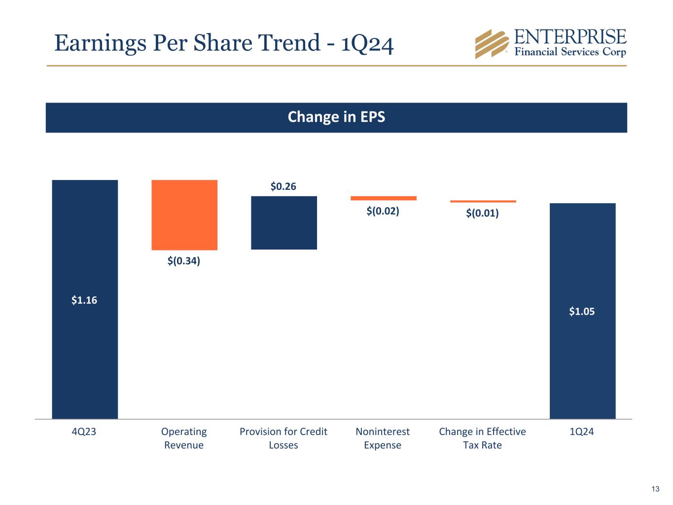 Earnings Per Share Trend - 1Q24 $1.16 $(0.34) $0.26 $(0.02) $(0.01) $1.05 4Q23 Operating Revenue Provision for Credit Losses Noninterest Expense Change in Effective Tax Rate 1Q24 Change in EPS 13