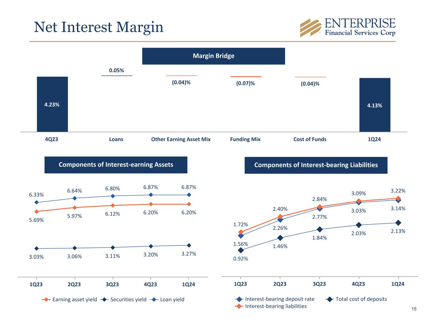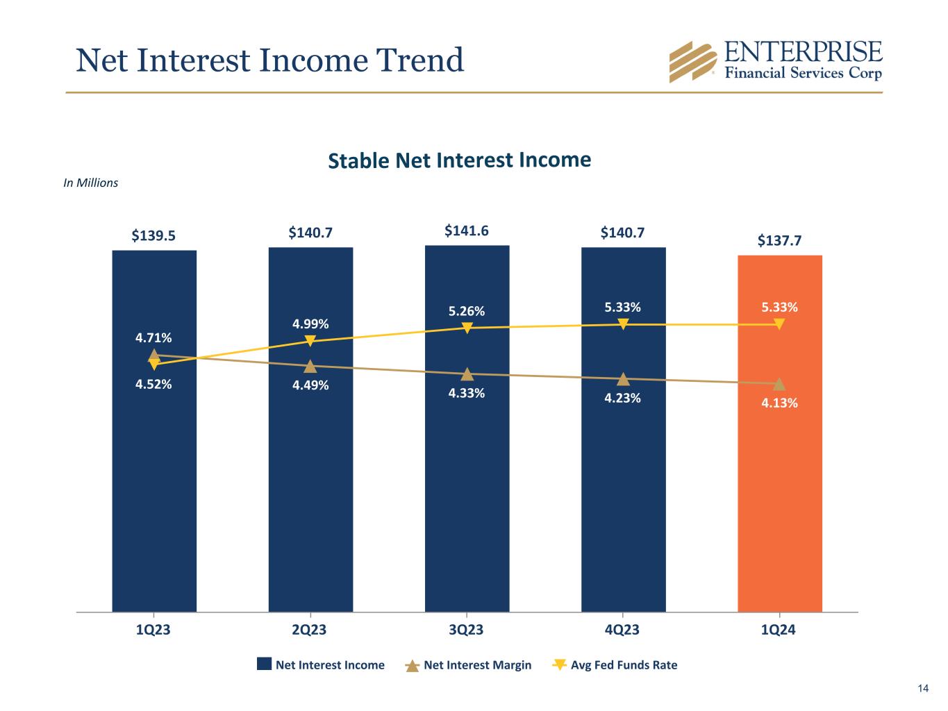 $139.5 $140.7 $141.6 $140.7 $137.7 4.71% 4.49% 4.33% 4.23% 4.13% 4.52% 4.99% 5.26% 5.33% 5.33% Net Interest Income Net Interest Margin Avg Fed Funds Rate 1Q23 2Q23 3Q23 4Q23 1Q24 Net Interest Income Trend In Millions Stable Net Interest Income 14