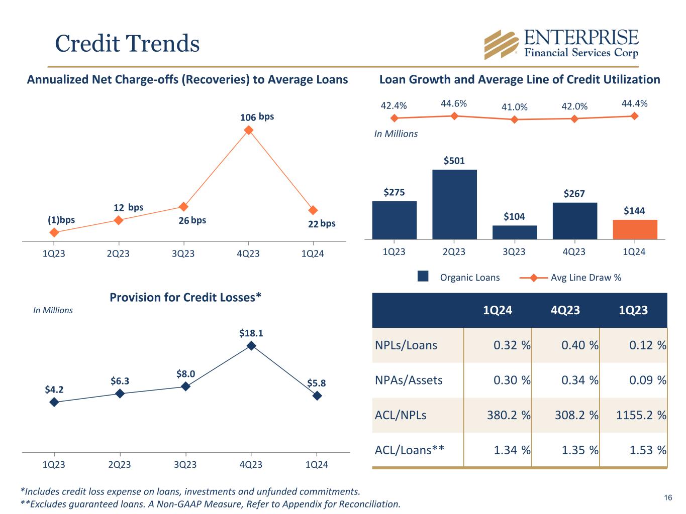Net Interest Margin 6.33% 6.64% 6.80% 6.87% 6.87% 3.03% 3.06% 3.11% 3.20% 3.27% 5.69% 5.97% 6.12% 6.20% 6.20% Earning asset yield Securities yield Loan yield 1Q23 2Q23 3Q23 4Q23 1Q24 1.56% 2.26% 2.77% 3.03% 3.14% 0.92% 1.46% 1.84% 2.03% 2.13% 1.72% 2.40% 2.84% 3.09% 3.22% Interest-bearing deposit rate Total cost of deposits Interest-bearing liabilities 1Q23 2Q23 3Q23 4Q23 1Q24 Components of Interest-bearing LiabilitiesComponents of Interest-earning Assets 4.23% 0.05% (0.04)% (0.07)% (0.04)% 4.13% 4Q23 Loans Other Earning Asset Mix Funding Mix Cost of Funds 1Q24 Margin Bridge 15