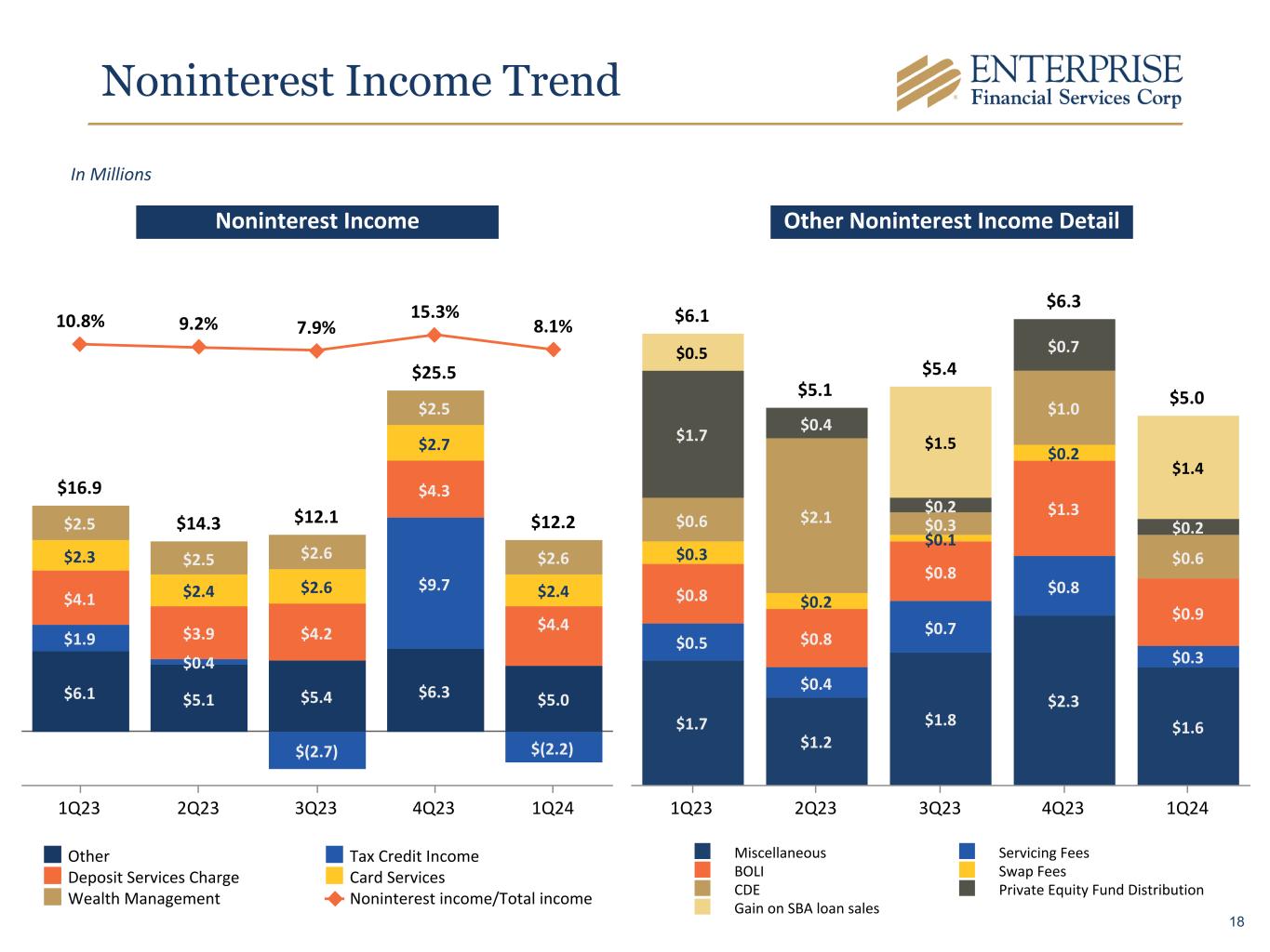 Noninterest Income Trend Other Noninterest Income DetailNoninterest Income In Millions $16.9 $14.3 $12.1 $25.5 $12.2 $6.1 $5.1 $5.4 $6.3 $5.0 $1.9 $0.4 $(2.7) $9.7 $(2.2) $4.1 $3.9 $4.2 $4.3 $4.4 $2.3 $2.4 $2.6 $2.7 $2.4 $2.5 $2.5 $2.6 $2.5 $2.6 10.8% 9.2% 7.9% 15.3% 8.1% Other Tax Credit Income Deposit Services Charge Card Services Wealth Management Noninterest income/Total income 1Q23 2Q23 3Q23 4Q23 1Q24 $6.1 $5.1 $5.4 $6.3 $5.0 $1.7 $1.2 $1.8 $2.3 $1.6 $0.5 $0.4 $0.7 $0.8 $0.3 $0.8 $0.8 $0.8 $1.3 $0.9 $0.3 $0.2 $0.1 $0.2 $0.6 $2.1 $0.3 $1.0 $0.6 $1.7 $0.4 $0.2 $0.7 $0.2 $0.5 $1.5 $1.4 Miscellaneous Servicing Fees BOLI Swap Fees CDE Private Equity Fund Distribution Gain on SBA loan sales 1Q23 2Q23 3Q23 4Q23 1Q24 18