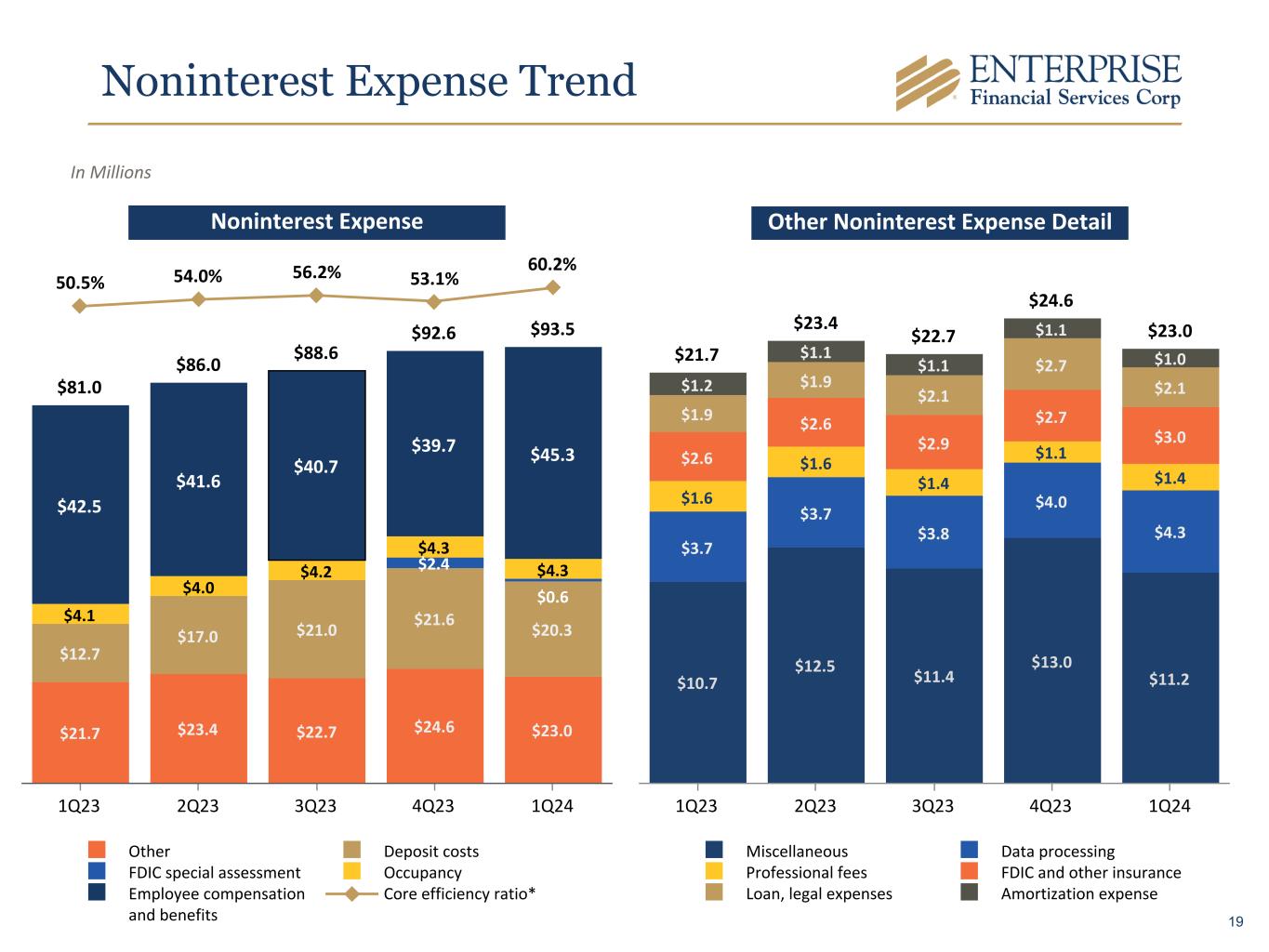 Noninterest Expense Trend Other Noninterest Expense DetailNoninterest Expense In Millions $81.0 $86.0 $88.6 $92.6 $93.5 $21.7 $23.4 $22.7 $24.6 $23.0 $12.7 $17.0 $21.0 $21.6 $20.3 $2.4 $0.6 $4.1 $4.0 $4.2 $4.3 $4.3 $42.5 $41.6 $40.7 $39.7 $45.3 50.5% 54.0% 56.2% 53.1% 60.2% Other Deposit costs FDIC special assessment Occupancy Employee compensation and benefits Core efficiency ratio* 1Q23 2Q23 3Q23 4Q23 1Q24 $21.7 $23.4 $22.7 $24.6 $23.0 $10.7 $12.5 $11.4 $13.0 $11.2 $3.7 $3.7 $3.8 $4.0 $4.3 $1.6 $1.6 $1.4 $1.1 $1.4 $2.6 $2.6 $2.9 $2.7 $3.0 $1.9 $1.9 $2.1 $2.7 $2.1$1.2 $1.1 $1.1 $1.1 $1.0 Miscellaneous Data processing Professional fees FDIC and other insurance Loan, legal expenses Amortization expense 1Q23 2Q23 3Q23 4Q23 1Q24 19