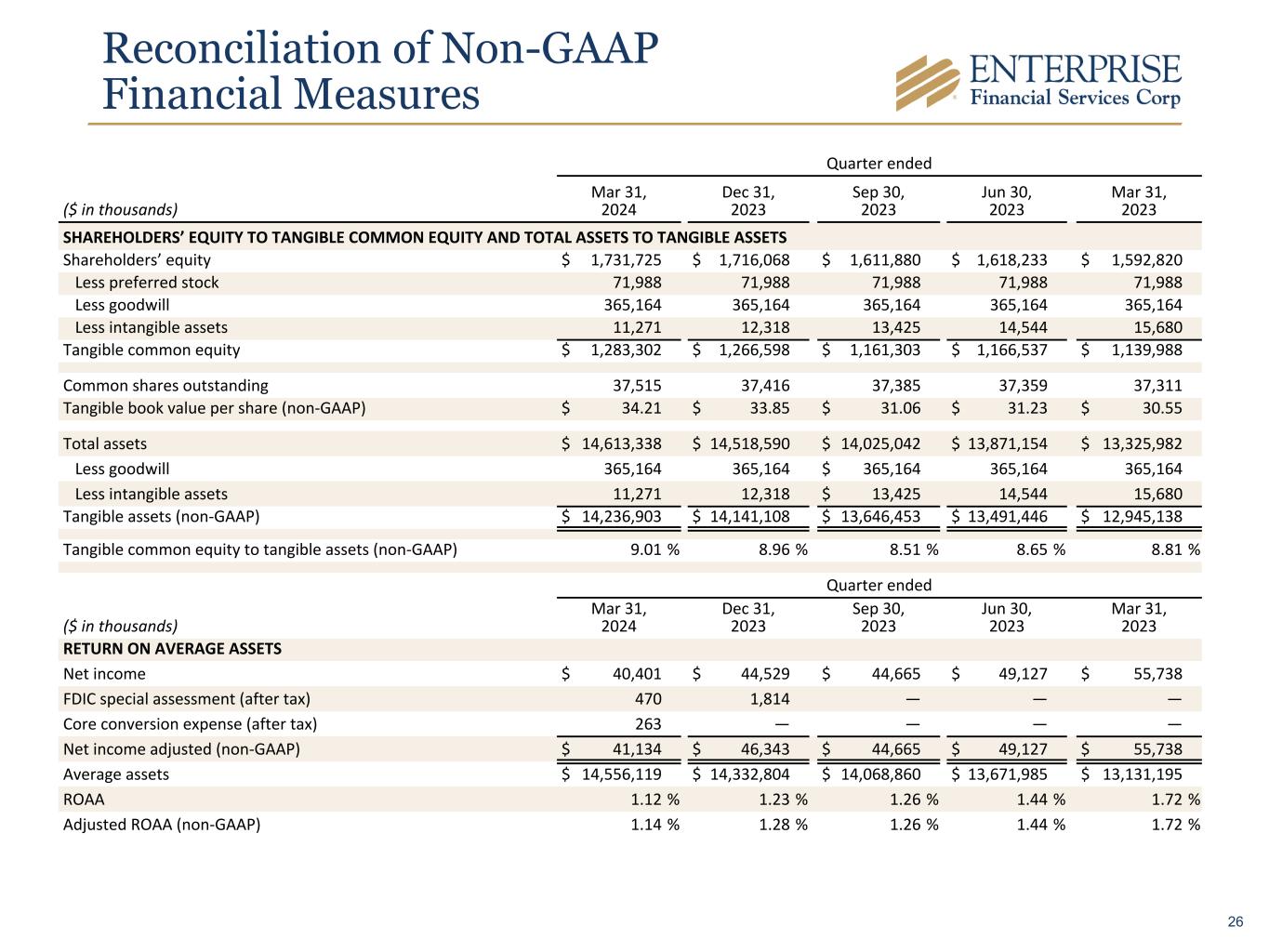 Reconciliation of Non-GAAP Financial Measures Quarter ended ($ in thousands) Mar 31, 2024 Dec 31, 2023 Sep 30, 2023 Jun 30, 2023 Mar 31, 2023 SHAREHOLDERS’ EQUITY TO TANGIBLE COMMON EQUITY AND TOTAL ASSETS TO TANGIBLE ASSETS Shareholders’ equity $ 1,731,725 $ 1,716,068 $ 1,611,880 $ 1,618,233 $ 1,592,820 Less preferred stock 71,988 71,988 71,988 71,988 71,988 Less goodwill 365,164 365,164 365,164 365,164 365,164 Less intangible assets 11,271 12,318 13,425 14,544 15,680 Tangible common equity $ 1,283,302 $ 1,266,598 $ 1,161,303 $ 1,166,537 $ 1,139,988 Common shares outstanding 37,515 37,416 37,385 37,359 37,311 Tangible book value per share (non-GAAP) $ 34.21 $ 33.85 $ 31.06 $ 31.23 $ 30.55 Total assets $ 14,613,338 $ 14,518,590 $ 14,025,042 $ 13,871,154 $ 13,325,982 Less goodwill 365,164 365,164 $ 365,164 365,164 365,164 Less intangible assets 11,271 12,318 $ 13,425 14,544 15,680 Tangible assets (non-GAAP) $ 14,236,903 $ 14,141,108 $ 13,646,453 $ 13,491,446 $ 12,945,138 Tangible common equity to tangible assets (non-GAAP) 9.01 % 8.96 % 8.51 % 8.65 % 8.81 % Quarter ended ($ in thousands) Mar 31, 2024 Dec 31, 2023 Sep 30, 2023 Jun 30, 2023 Mar 31, 2023 RETURN ON AVERAGE ASSETS Net income $ 40,401 $ 44,529 $ 44,665 $ 49,127 $ 55,738 FDIC special assessment (after tax) 470 1,814 — — — Core conversion expense (after tax) 263 — — — — Net income adjusted (non-GAAP) $ 41,134 $ 46,343 $ 44,665 $ 49,127 $ 55,738 Average assets $ 14,556,119 $ 14,332,804 $ 14,068,860 $ 13,671,985 $ 13,131,195 ROAA 1.12 % 1.23 % 1.26 % 1.44 % 1.72 % Adjusted ROAA (non-GAAP) 1.14 % 1.28 % 1.26 % 1.44 % 1.72 % 26