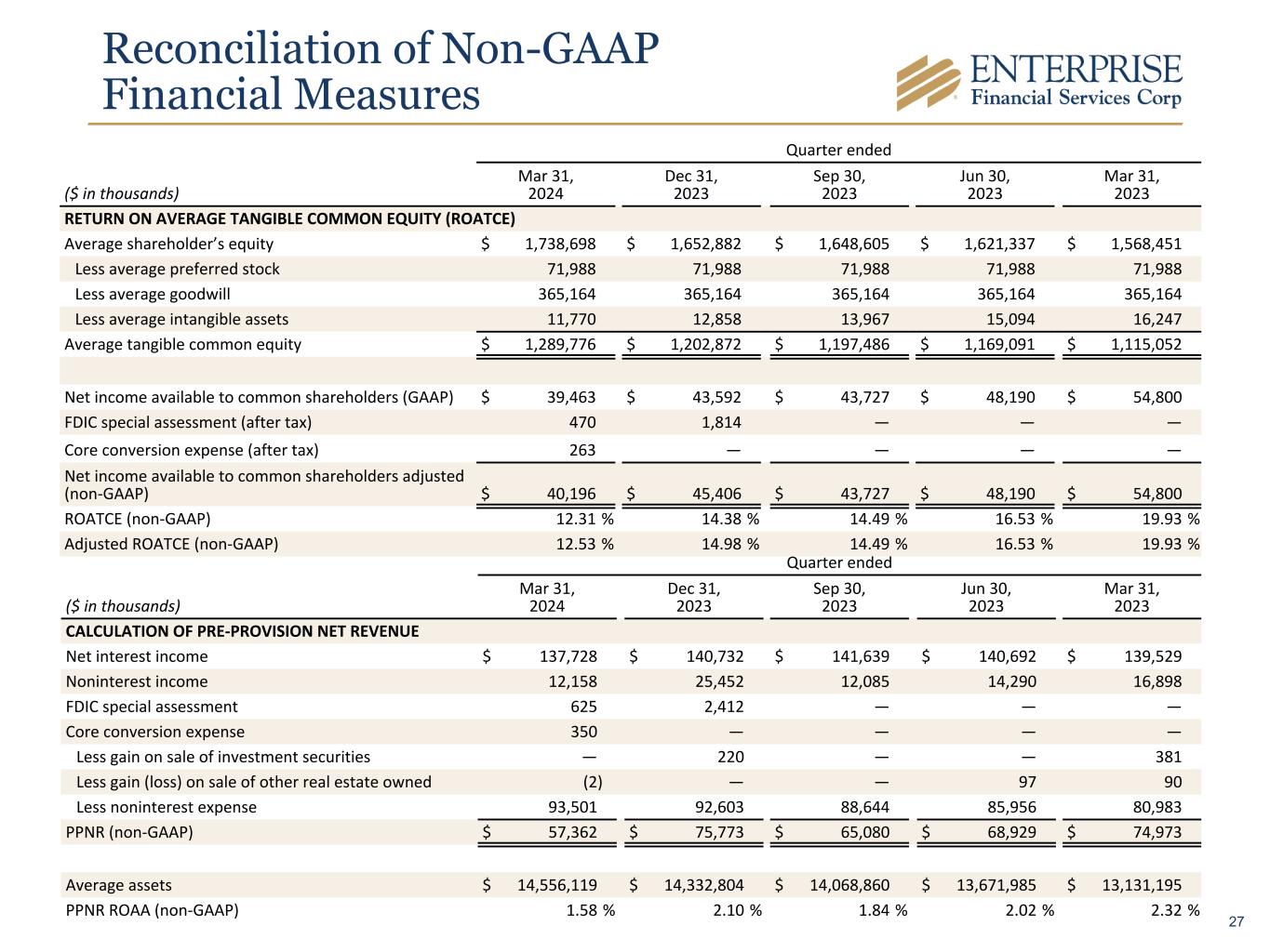 Reconciliation of Non-GAAP Financial Measures Quarter ended ($ in thousands) Mar 31, 2024 Dec 31, 2023 Sep 30, 2023 Jun 30, 2023 Mar 31, 2023 CALCULATION OF PRE-PROVISION NET REVENUE Net interest income $ 137,728 $ 140,732 $ 141,639 $ 140,692 $ 139,529 Noninterest income 12,158 25,452 12,085 14,290 16,898 FDIC special assessment 625 2,412 — — — Core conversion expense 350 — — — — Less gain on sale of investment securities — 220 — — 381 Less gain (loss) on sale of other real estate owned (2) — — 97 90 Less noninterest expense 93,501 92,603 88,644 85,956 80,983 PPNR (non-GAAP) $ 57,362 $ 75,773 $ 65,080 $ 68,929 $ 74,973 Average assets $ 14,556,119 $ 14,332,804 $ 14,068,860 $ 13,671,985 $ 13,131,195 PPNR ROAA (non-GAAP) 1.58 % 2.10 % 1.84 % 2.02 % 2.32 % Quarter ended ($ in thousands) Mar 31, 2024 Dec 31, 2023 Sep 30, 2023 Jun 30, 2023 Mar 31, 2023 RETURN ON AVERAGE TANGIBLE COMMON EQUITY (ROATCE) Average shareholder’s equity $ 1,738,698 $ 1,652,882 $ 1,648,605 $ 1,621,337 $ 1,568,451 Less average preferred stock 71,988 71,988 71,988 71,988 71,988 Less average goodwill 365,164 365,164 365,164 365,164 365,164 Less average intangible assets 11,770 12,858 13,967 15,094 16,247 Average tangible common equity $ 1,289,776 $ 1,202,872 $ 1,197,486 $ 1,169,091 $ 1,115,052 Net income available to common shareholders (GAAP) $ 39,463 $ 43,592 $ 43,727 $ 48,190 $ 54,800 FDIC special assessment (after tax) 470 1,814 — — — Core conversion expense (after tax) 263 — — — — Net income available to common shareholders adjusted (non-GAAP) $ 40,196 $ 45,406 $ 43,727 $ 48,190 $ 54,800 ROATCE (non-GAAP) 12.31 % 14.38 % 14.49 % 16.53 % 19.93 % Adjusted ROATCE (non-GAAP) 12.53 % 14.98 % 14.49 % 16.53 % 19.93 % 27