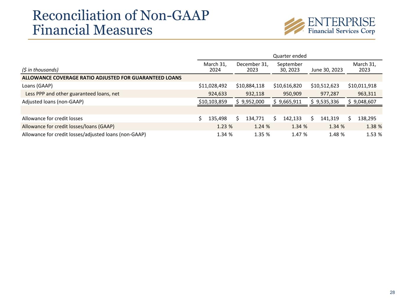 Reconciliation of Non-GAAP Financial Measures Quarter ended ($ in thousands) March 31, 2024 December 31, 2023 September 30, 2023 June 30, 2023 March 31, 2023 ALLOWANCE COVERAGE RATIO ADJUSTED FOR GUARANTEED LOANS Loans (GAAP) $ 11,028,492 $ 10,884,118 $ 10,616,820 $ 10,512,623 $ 10,011,918 Less PPP and other guaranteed loans, net 924,633 932,118 950,909 977,287 963,311 Adjusted loans (non-GAAP) $ 10,103,859 $ 9,952,000 $ 9,665,911 $ 9,535,336 $ 9,048,607 Allowance for credit losses $ 135,498 $ 134,771 $ 142,133 $ 141,319 $ 138,295 Allowance for credit losses/loans (GAAP) 1.23 % 1.24 % 1.34 % 1.34 % 1.38 % Allowance for credit losses/adjusted loans (non-GAAP) 1.34 % 1.35 % 1.47 % 1.48 % 1.53 % 28