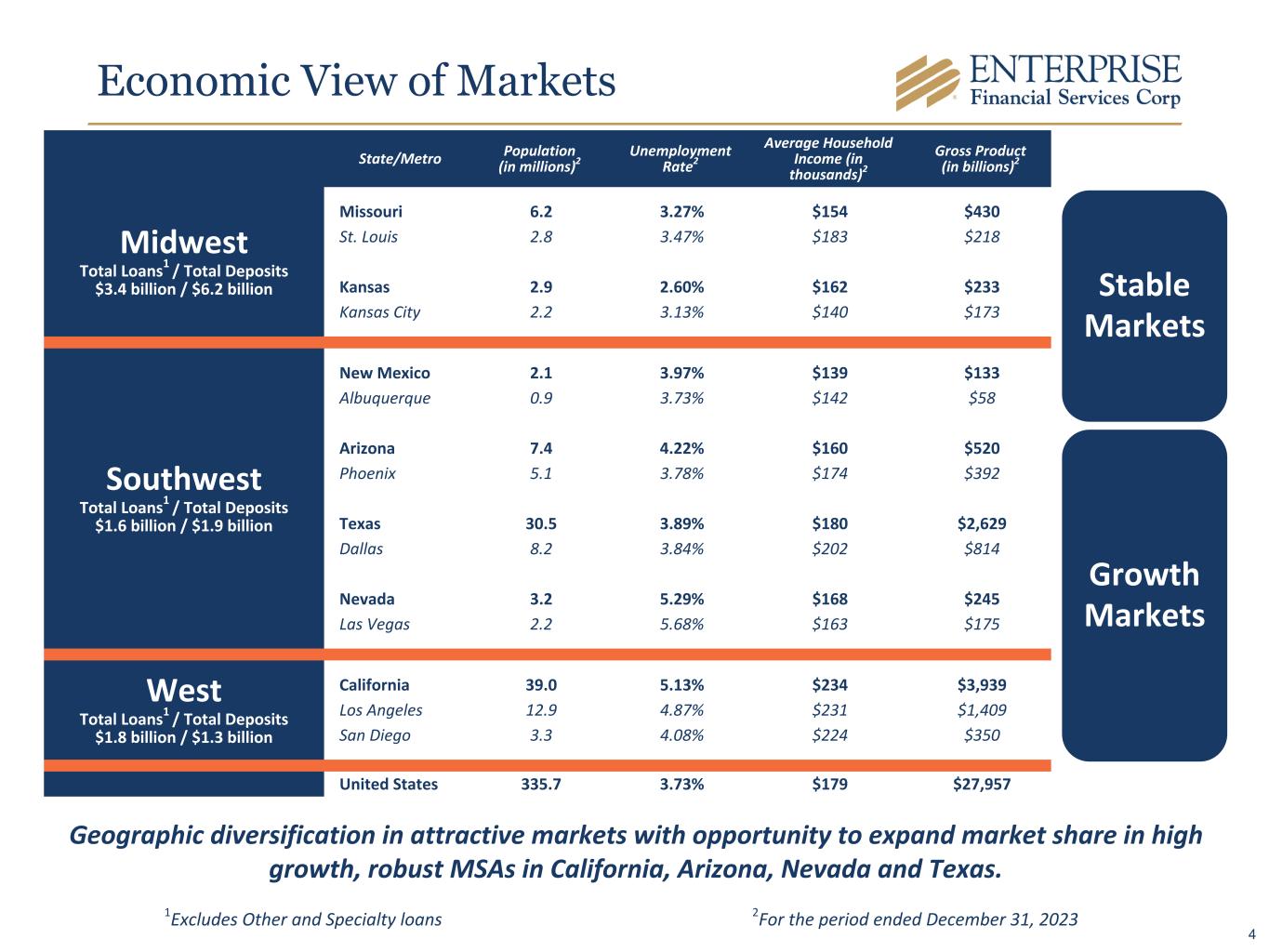 Enterprise Financial Services Corp Operates in St. Louis Kansas City Phoenix New Mexico Los Angeles Las Vegas The Company has deposit and SBA loan production offices across the country. San Diego Dallas* Orlando Focused on Privately Owned Businesses and Business Owners Commercial Lending Lending Verticals Deposit VerticalsCommercial Deposits • C&I focus • Business banking • CRE lending • Blend of stable and growth MSAs • National SBA 7(a) lending • Sponsor finance • Tax credits • Life insurance premium finance • Community associations • Property management • Third party escrow • Trust services • Highly productive network of 42 branches with $223M2 average deposits per branch • Complete and easy to use cash management services NASDAQ: EFSC / EFSCP $1.5B r $14.6B Total assets $11.0B Loans / $12.3B Deposits 9.01% TCE Ratio1 1.14% Adjusted ROAA YTD1 12.5% Adjusted ROATCE YTD1 10.4% r 2.66% r Differentiated Business Model Market Cap As of 4/24/2024 1A Non-GAAP Measure, Refer to Appendix for Reconciliation. 10 yr CAGR of TBV / Share (vs 6.3% for the KRX) Dividend Yield As of 4/24/2024 17.6% 10 yr loan growth CAGR 17.4% 10 yr deposit growth CAGR *Loan production office Regional National 2Excluding differentiated deposit vertical 3