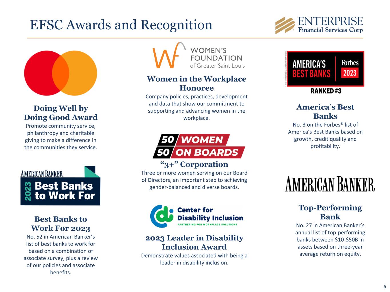 EFSC Awards and Recognition Doing Well by Doing Good Award Promote community service, philanthropy and charitable giving to make a difference in the communities they service. America’s Best Banks No. 3 on the Forbes® list of America’s Best Banks based on growth, credit quality and profitability. Women in the Workplace Honoree Company policies, practices, development and data that show our commitment to supporting and advancing women in the workplace. “3+” Corporation Three or more women serving on our Board of Directors, an important step to achieving gender-balanced and diverse boards. 2023 Leader in Disability Inclusion Award Demonstrate values associated with being a leader in disability inclusion. Top-Performing Bank No. 27 in American Banker’s annual list of top-performing banks between $10-$50B in assets based on three-year average return on equity. Best Banks to Work For 2023 No. 52 in American Banker’s list of best banks to work for based on a combination of associate survey, plus a review of our policies and associate benefits. 5