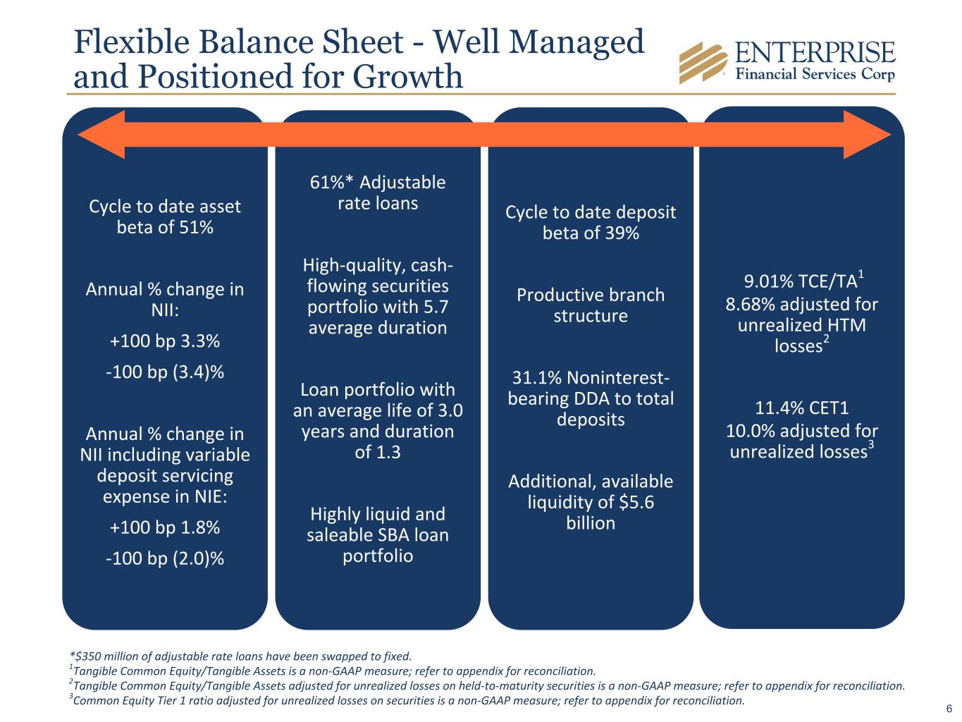 Cycle to date asset beta of 51% Annual % change in NII: +100 bp 3.3% -100 bp (3.4)% Annual % change in NII including variable deposit servicing expense in NIE: +100 bp 1.8% -100 bp (2.0)% 61%* Adjustable rate loans High-quality, cash- flowing securities portfolio with 5.7 average duration Loan portfolio with an average life of 3.0 years and duration of 1.3 Highly liquid and saleable SBA loan portfolio Cycle to date deposit beta of 39% Productive branch structure 31.1% Noninterest- bearing DDA to total deposits Additional, available liquidity of $5.6 billion 9.01% TCE/TA1 8.68% adjusted for unrealized HTM losses2 11.4% CET1 10.0% adjusted for unrealized losses3 Flexible Balance Sheet - Well Managed and Positioned for Growth *$350 million of adjustable rate loans have been swapped to fixed. 1Tangible Common Equity/Tangible Assets is a non-GAAP measure; refer to appendix for reconciliation. 2Tangible Common Equity/Tangible Assets adjusted for unrealized losses on held-to-maturity securities is a non-GAAP measure; refer to appendix for reconciliation. 3Common Equity Tier 1 ratio adjusted for unrealized losses on securities is a non-GAAP measure; refer to appendix for reconciliation. 6