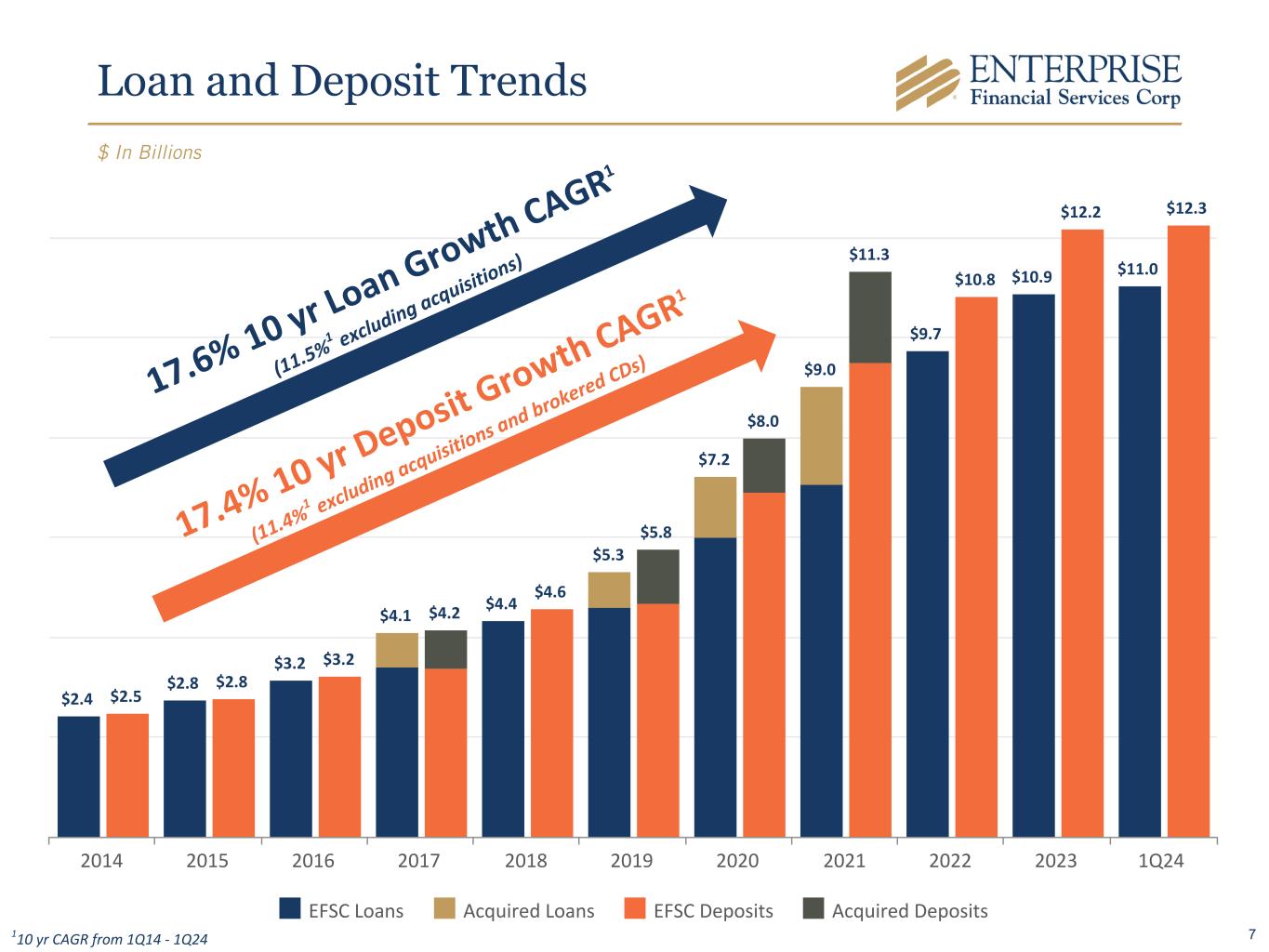 $2.4 $2.8 $3.2 $4.1 $4.4 $5.3 $7.2 $9.0 $9.7 $10.9 $11.0 $2.5 $2.8 $3.2 $4.2 $4.6 $5.8 $8.0 $11.3 $10.8 $12.2 $12.3 EFSC Loans Acquired Loans EFSC Deposits Acquired Deposits 2014 2015 2016 2017 2018 2019 2020 2021 2022 2023 1Q24 $ In Billions 17.4 % 1 0 yr Dep osit Gro wth CAG R1 (11. 4% 1 exc ludi ng a cqu isiti ons and bro kere d CD s)17.6 % 1 0 yr Loa n Gr owt h CA GR 1 (11. 5% 1 exc ludi ng a cqu isiti ons ) Loan and Deposit Trends 110 yr CAGR from 1Q14 - 1Q24 7