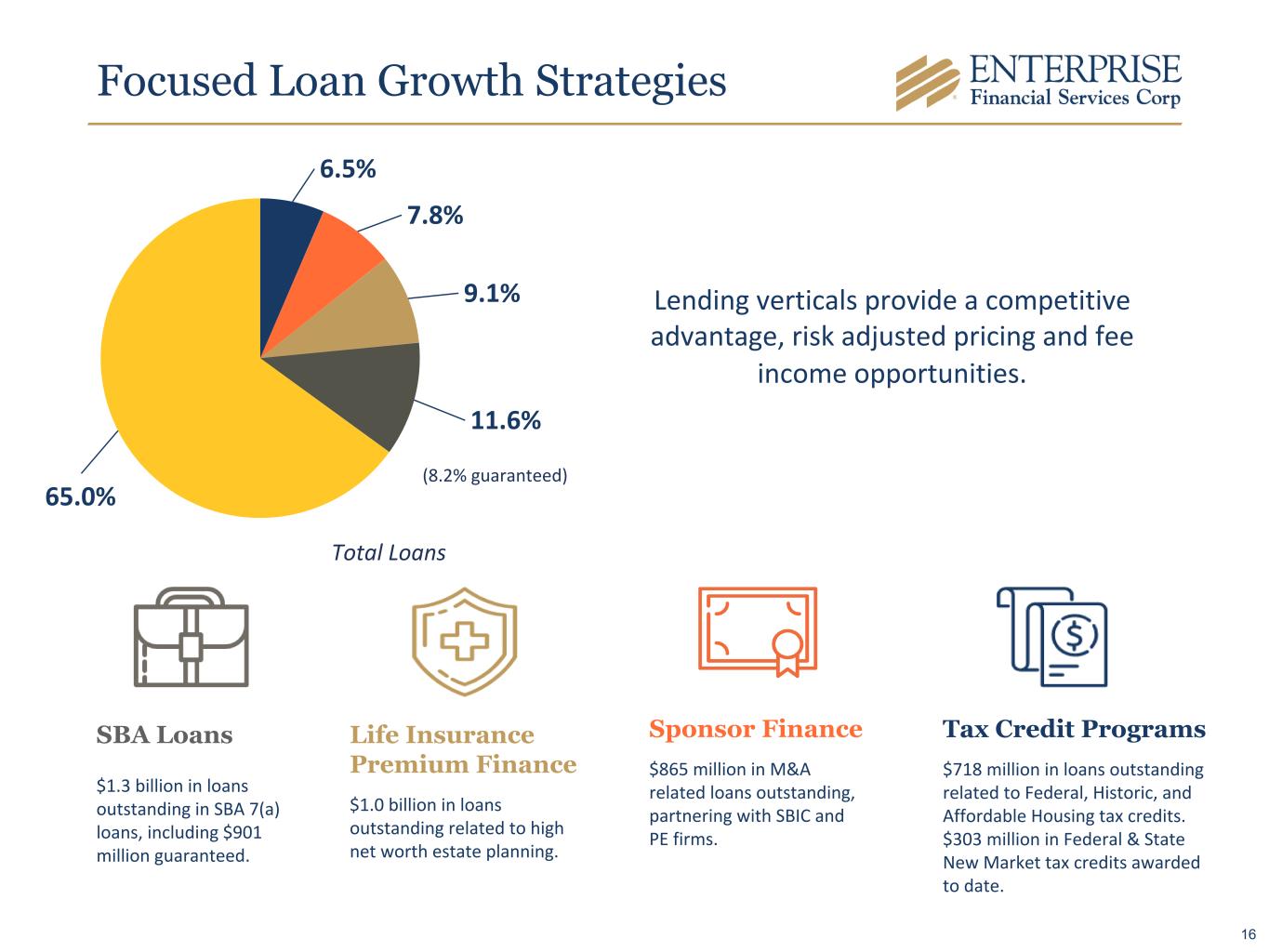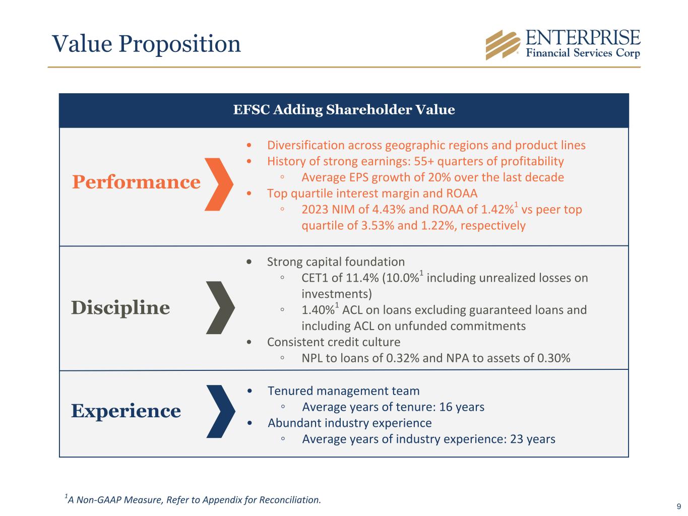 M&A Diversifies & Complements Organic Growth M&A Strategy Growth History $5.3 $5.6 $7.3 $9.8 $13.5 $13.1 $14.5 $4.4 $6.1 $8.5 $11.3 $0.9 $1.2 $1.3 $2.2 EFSC Assets Merger Contribution 2017 2018 2019 2020 2021 2022 2023 $ In Billions Strategically enhanced geographic diversification and product lines through select M&A transactions. These transactions provided: * Entry into vibrant and growing markets * Granular, low-cost deposit base in New Mexico and St. Louis (Trinity and JC Bankshares) * Deepened C&I focus in California market (First Choice) * National Specialty Deposit Platform (Seacoast) * National SBA Lending Platform (Seacoast) 8