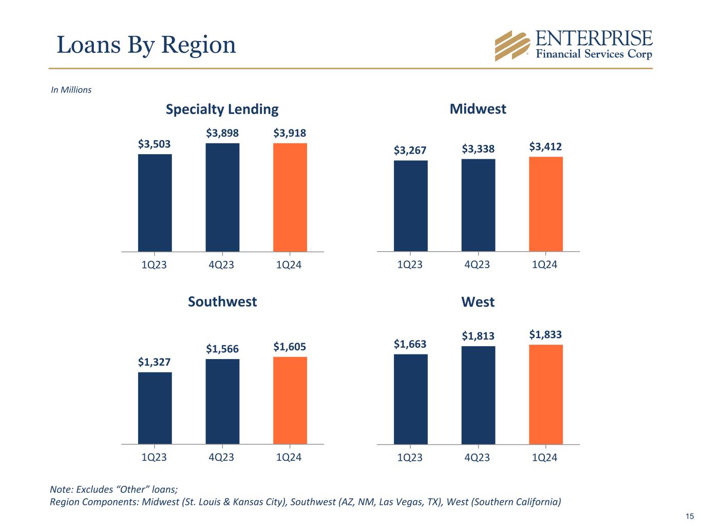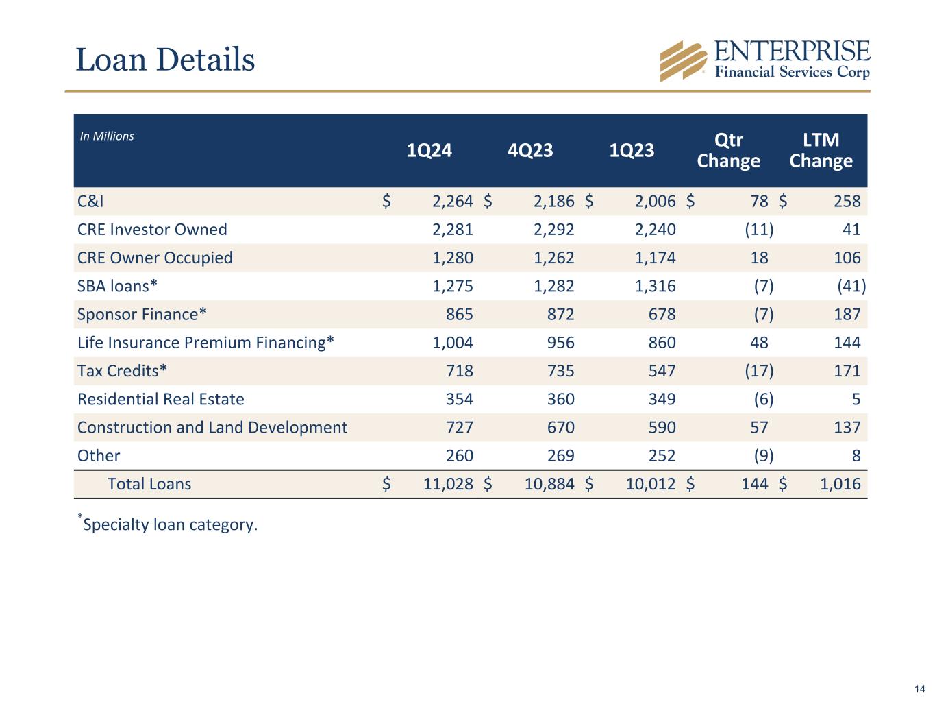 Loan Details 1Q24 4Q23 1Q23 Qtr Change LTM Change C&I $ 2,264 $ 2,186 $ 2,006 $ 78 $ 258 CRE Investor Owned 2,281 2,292 2,240 (11) 41 CRE Owner Occupied 1,280 1,262 1,174 18 106 SBA loans* 1,275 1,282 1,316 (7) (41) Sponsor Finance* 865 872 678 (7) 187 Life Insurance Premium Financing* 1,004 956 860 48 144 Tax Credits* 718 735 547 (17) 171 Residential Real Estate 354 360 349 (6) 5 Construction and Land Development 727 670 590 57 137 Other 260 269 252 (9) 8 Total Loans $ 11,028 $ 10,884 $ 10,012 $ 144 $ 1,016 *Specialty loan category. In Millions 14