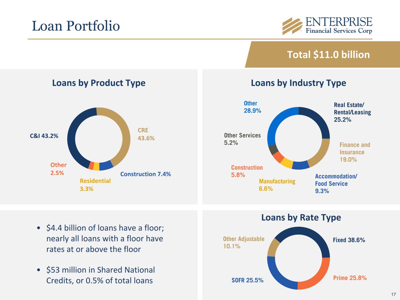 6.5% 7.8% 9.1% 11.6% 65.0% Focused Loan Growth Strategies Total Loans Lending verticals provide a competitive advantage, risk adjusted pricing and fee income opportunities. Tax Credit Programs $718 million in loans outstanding related to Federal, Historic, and Affordable Housing tax credits. $303 million in Federal & State New Market tax credits awarded to date. Sponsor Finance $865 million in M&A related loans outstanding, partnering with SBIC and PE firms. Life Insurance Premium Finance $1.0 billion in loans outstanding related to high net worth estate planning. SBA Loans $1.3 billion in loans outstanding in SBA 7(a) loans, including $901 million guaranteed. (8.2% guaranteed) 16