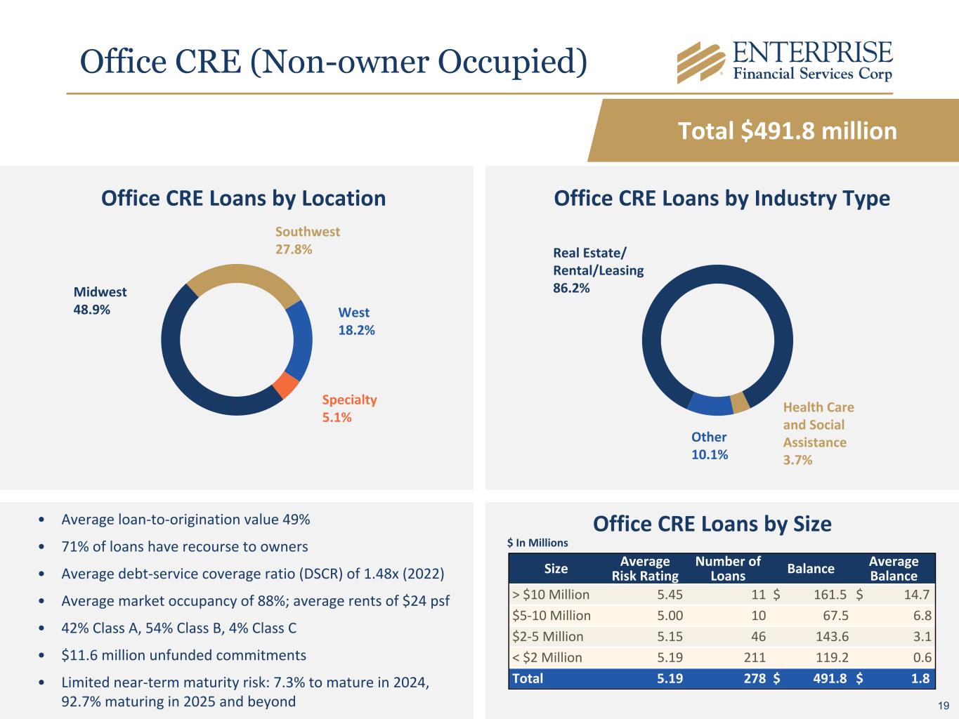 Sponsor Finance Administrative and Support 10.9% Construction 8.4% Health Care and Social Assistance 12.0% Manufacturing 22.7% Wholesale Trade 12.0% Other 34.0% Sponsor Finance Loans by Industry TypeSponsor Finance Loans & Deposits by Period $677.5 $879.5 $888.0 $872.3 $865.2 $320.0 $307.3 $375.9 $403.0 $359.0 Loans Deposits 1Q23 2Q23 3Q23 4Q23 1Q24 • Provides flexible cash-flow based senior debt financing to assist private equity sponsors in acquiring or recapitalizing their portfolio companies • Strength and reputation of the sponsor are critical components of the underwriting process; the Company has selectively invested in certain sponsors as a limited partner • Strategy includes working with ~100 different sponsors, most of which invest out of a fund and are licensed as SBIC’s $ in Millions • Since 2004, sponsor finance has completed over 500 transactions diversified throughout the country in various industries • Senior debt leverage of 1.48x; total leverage of 3.39x on average for the portfolio • Loans outstanding of $865.2 million (8.46% yield) and deposits outstanding of $359.0 million, representing a relationship base of ~135 portfolio companies under management • Allowance coverage ratio of 2.62% on sponsor finance loans Total $865.2 million 18