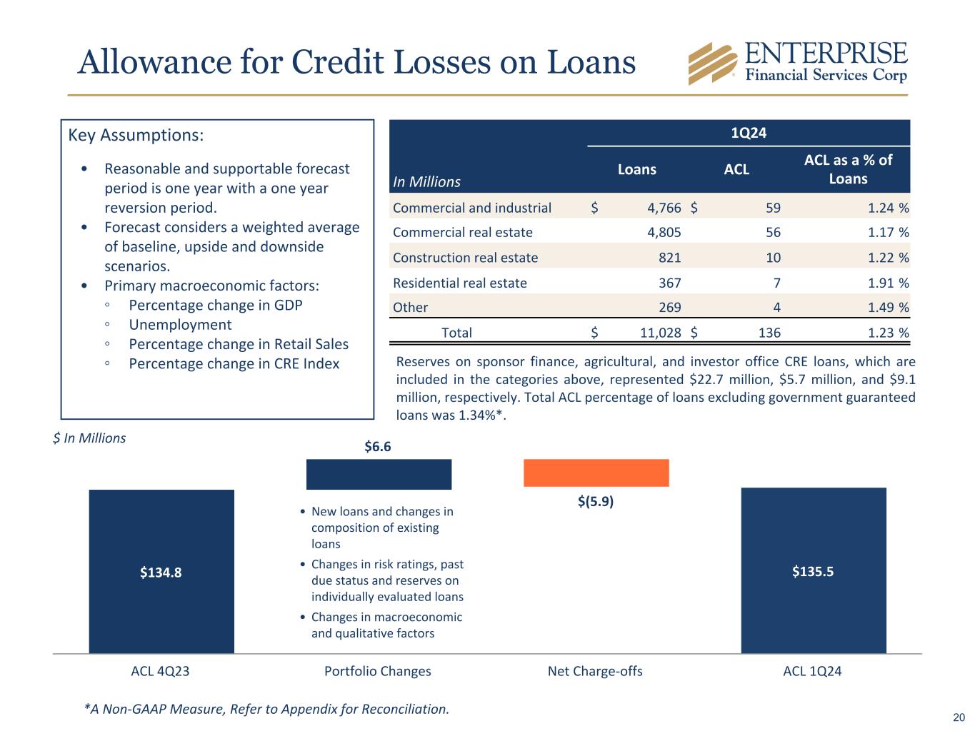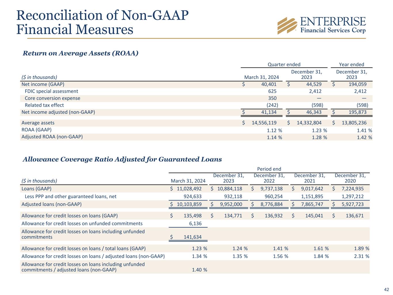 Quarter ended Year ended ($ in thousands) March 31, 2024 December 31, 2023 December 31, 2023 Net income (GAAP) $ 40,401 $ 44,529 $ 194,059 FDIC special assessment 625 2,412 2,412 Core conversion expense 350 — — Related tax effect (242) (598) (598) Net income adjusted (non-GAAP) $ 41,134 $ 46,343 $ 195,873 Average assets $ 14,556,119 $ 14,332,804 $ 13,805,236 ROAA (GAAP) 1.12 % 1.23 % 1.41 % Adjusted ROAA (non-GAAP) 1.14 % 1.28 % 1.42 % Allowance Coverage Ratio Adjusted for Guaranteed Loans Period end ($ in thousands) March 31, 2024 December 31, 2023 December 31, 2022 December 31, 2021 December 31, 2020 Loans (GAAP) $ 11,028,492 $ 10,884,118 $ 9,737,138 $ 9,017,642 $ 7,224,935 Less PPP and other guaranteed loans, net 924,633 932,118 960,254 1,151,895 1,297,212 Adjusted loans (non-GAAP) $ 10,103,859 $ 9,952,000 $ 8,776,884 $ 7,865,747 $ 5,927,723 Allowance for credit losses on loans (GAAP) $ 135,498 $ 134,771 $ 136,932 $ 145,041 $ 136,671 Allowance for credit losses on unfunded commitments 6,136 Allowance for credit losses on loans including unfunded commitments $ 141,634 Allowance for credit losses on loans / total loans (GAAP) 1.23 % 1.24 % 1.41 % 1.61 % 1.89 % Allowance for credit losses on loans / adjusted loans (non-GAAP) 1.34 % 1.35 % 1.56 % 1.84 % 2.31 % Allowance for credit losses on loans including unfunded commitments / adjusted loans (non-GAAP) 1.40 % Reconciliation of Non-GAAP Financial Measures Return on Average Assets (ROAA) 42