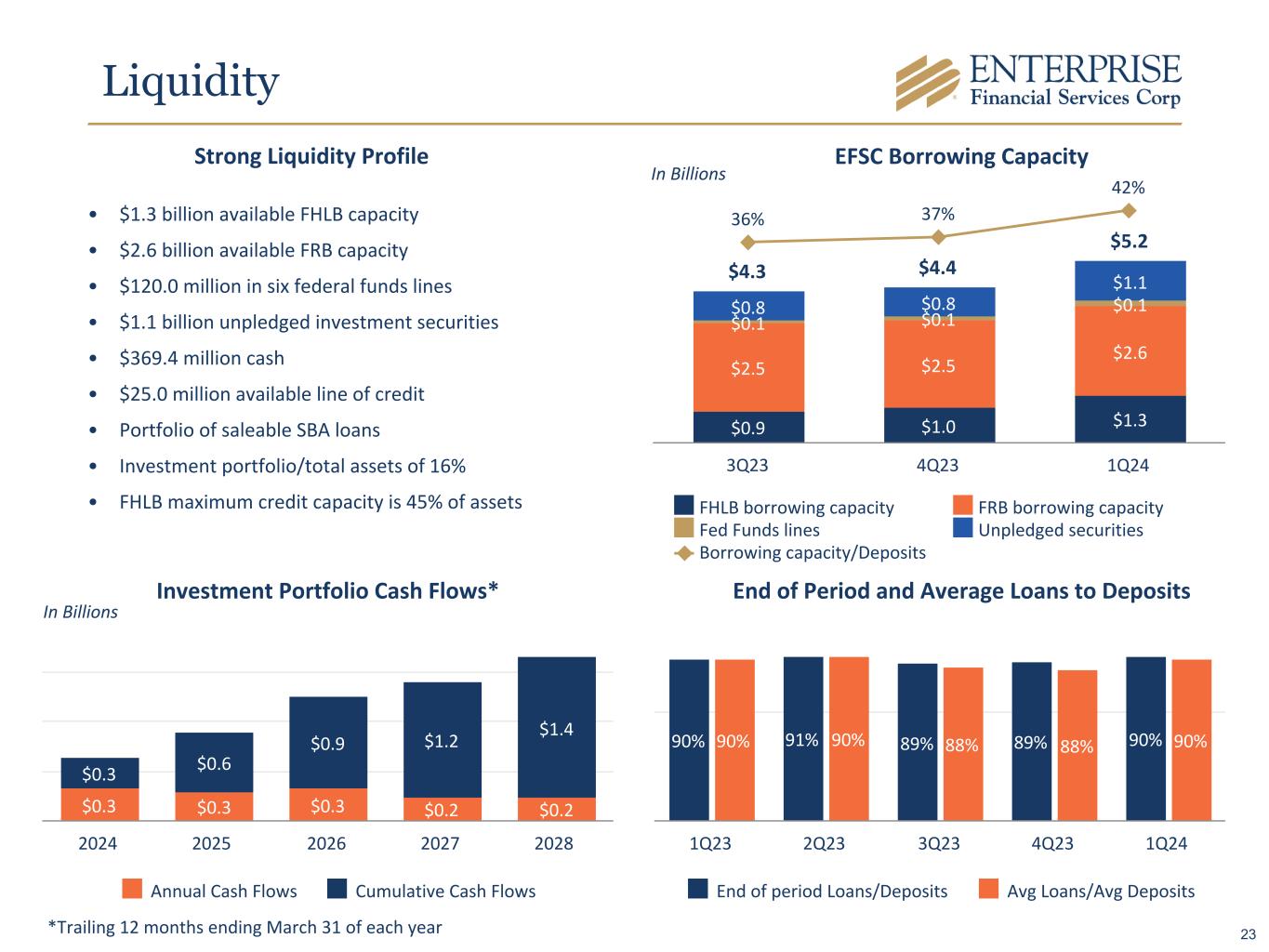 EFSC Borrowing Capacity $4.3 $4.4 $5.2 $0.9 $1.0 $1.3 $2.5 $2.5 $2.6 $0.1 $0.1 $0.1$0.8 $0.8 $1.1 36% 37% 42% FHLB borrowing capacity FRB borrowing capacity Fed Funds lines Unpledged securities Borrowing capacity/Deposits 3Q23 4Q23 1Q24 In Billions End of Period and Average Loans to Deposits 90% 91% 89% 89% 90%90% 90% 88% 88% 90% End of period Loans/Deposits Avg Loans/Avg Deposits 1Q23 2Q23 3Q23 4Q23 1Q24 • $1.3 billion available FHLB capacity • $2.6 billion available FRB capacity • $120.0 million in six federal funds lines • $1.1 billion unpledged investment securities • $369.4 million cash • $25.0 million available line of credit • Portfolio of saleable SBA loans • Investment portfolio/total assets of 16% • FHLB maximum credit capacity is 45% of assets $0.3 $0.3 $0.3 $0.2 $0.2 $0.3 $0.6 $0.9 $1.2 $1.4 Annual Cash Flows Cumulative Cash Flows 2024 2025 2026 2027 2028 Investment Portfolio Cash Flows* In Billions Strong Liquidity Profile *Trailing 12 months ending March 31 of each year Liquidity 23