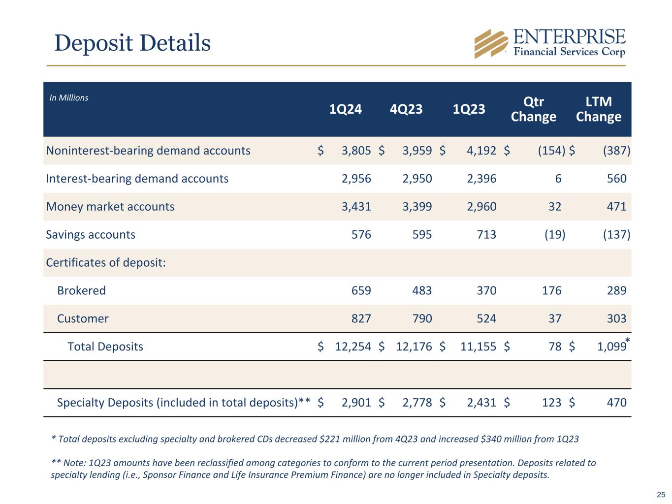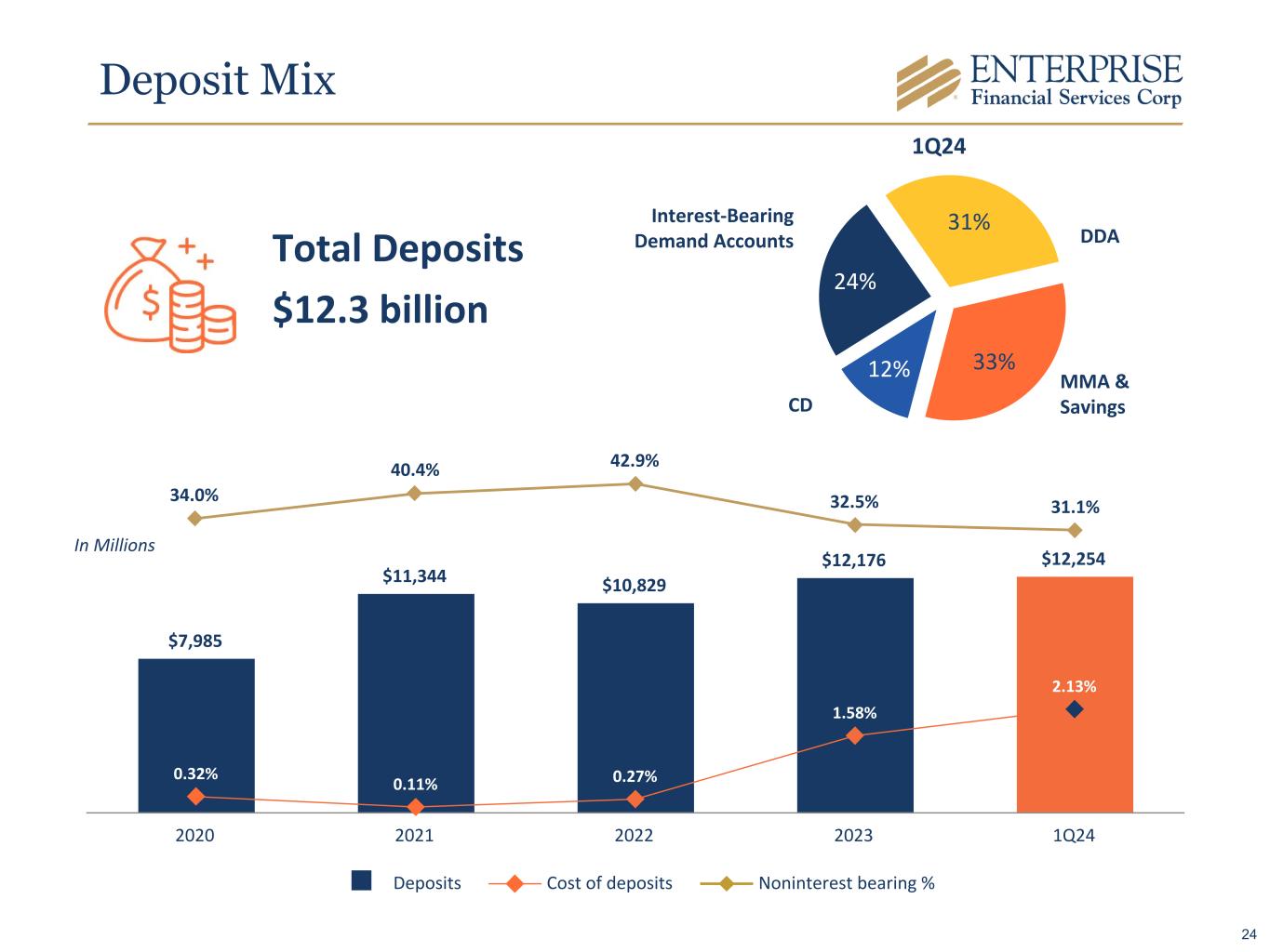 34.0% 40.4% 42.9% 32.5% 31.1% 31% 33%12% 24% $7,985 $11,344 $10,829 $12,176 $12,254 0.32% 0.11% 0.27% 1.58% 2.13% Deposits Cost of deposits Noninterest bearing % 2020 2021 2022 2023 1Q24 CD Interest-Bearing Demand Accounts DDA MMA & Savings In Millions Total Deposits $12.3 billion 1Q24 Deposit Mix 24