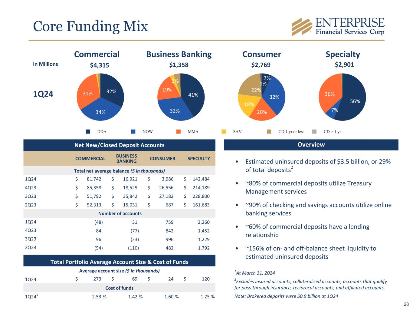 Core Funding Mix Commercial Business Banking Consumer In Millions $2,769$1,358$4,315 1At March 31, 2024 2Excludes insured accounts, collateralized accounts, accounts that qualify for pass-through insurance, reciprocal accounts, and affiliated accounts. Note: Brokered deposits were $0.9 billion at 1Q24 Specialty $2,901 1Q24 Net New/Closed Deposit Accounts COMMERCIAL BUSINESS BANKING CONSUMER SPECIALTY Total net average balance ($ in thousands) 1Q24 $ 81,742 $ 16,921 $ 3,986 $ 142,484 4Q23 $ 85,358 $ 18,529 $ 26,556 $ 214,189 3Q23 $ 51,792 $ 35,842 $ 27,182 $ 228,800 2Q23 $ 52,313 $ 15,031 $ 687 $ 161,683 Number of accounts 1Q24 (48) 31 759 2,260 4Q23 84 (77) 842 1,452 3Q23 96 (23) 996 1,229 2Q23 (54) (110) 482 1,792 Total Portfolio Average Account Size & Cost of Funds Average account size ($ in thousands) 1Q24 $ 273 $ 69 $ 24 $ 120 Cost of funds 1Q241 2.53 % 1.42 % 1.60 % 1.25 % • Estimated uninsured deposits of $3.5 billion, or 29% of total deposits2 • ~80% of commercial deposits utilize Treasury Management services • ~90% of checking and savings accounts utilize online banking services • ~60% of commercial deposits have a lending relationship • ~156% of on- and off-balance sheet liquidity to estimated uninsured deposits Overview 32% 34% 31% 41% 32% 19% 3% 7% 32% 20% 18% 22% 1% 56% 7% 36% 28