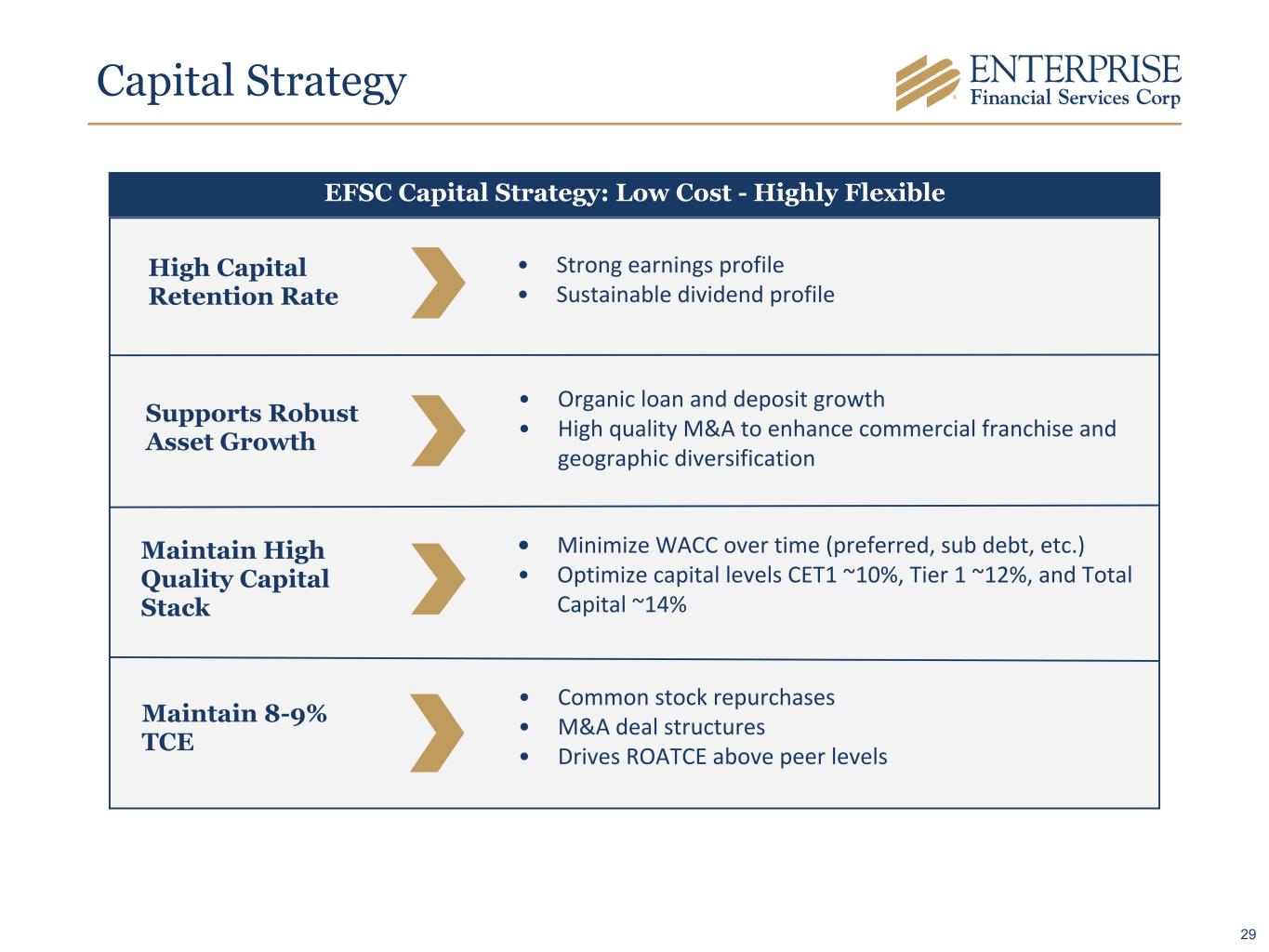 Capital Strategy EFSC Capital Strategy: Low Cost - Highly Flexible High Capital Retention Rate Supports Robust Asset Growth Maintain High Quality Capital Stack Maintain 8-9% TCE • Strong earnings profile • Sustainable dividend profile • Organic loan and deposit growth • High quality M&A to enhance commercial franchise and geographic diversification • Minimize WACC over time (preferred, sub debt, etc.) • Optimize capital levels CET1 ~10%, Tier 1 ~12%, and Total Capital ~14% • Common stock repurchases • M&A deal structures • Drives ROATCE above peer levels 29