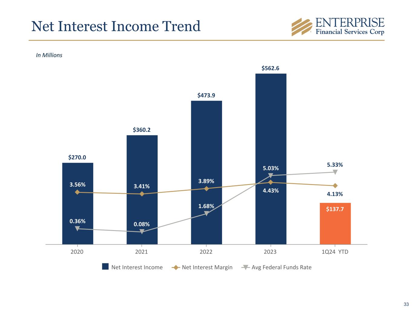 Net Interest Income Trend In Millions $270.0 $360.2 $473.9 $562.6 $137.7 3.56% 3.41% 3.89% 4.43% 4.13% 0.36% 0.08% 1.68% 5.03% 5.33% Net Interest Income Net Interest Margin Avg Federal Funds Rate 2020 2021 2022 2023 1Q24 YTD 33