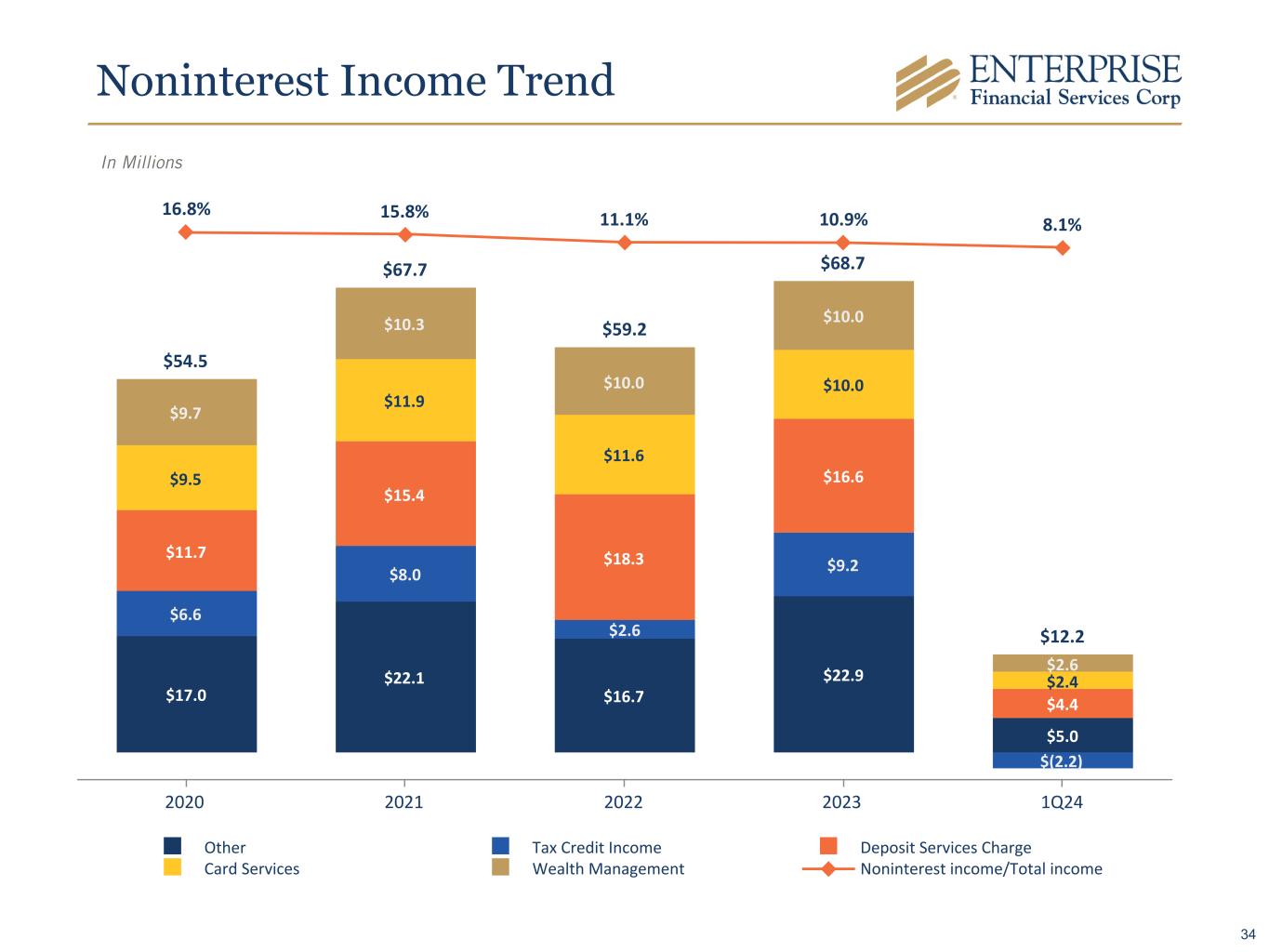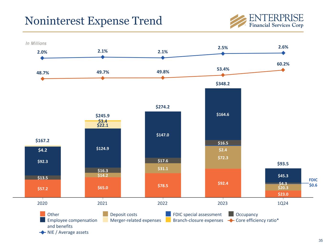 Noninterest Income Trend In Millions $54.5 $67.7 $59.2 $68.7 $12.2 $17.0 $22.1 $16.7 $22.9 $5.0 $6.6 $8.0 $2.6 $9.2 $(2.2) $11.7 $15.4 $18.3 $16.6 $4.4 $9.5 $11.9 $11.6 $10.0 $2.4 $9.7 $10.3 $10.0 $10.0 $2.6 16.8% 15.8% 11.1% 10.9% 8.1% Other Tax Credit Income Deposit Services Charge Card Services Wealth Management Noninterest income/Total income 2020 2021 2022 2023 1Q24 34