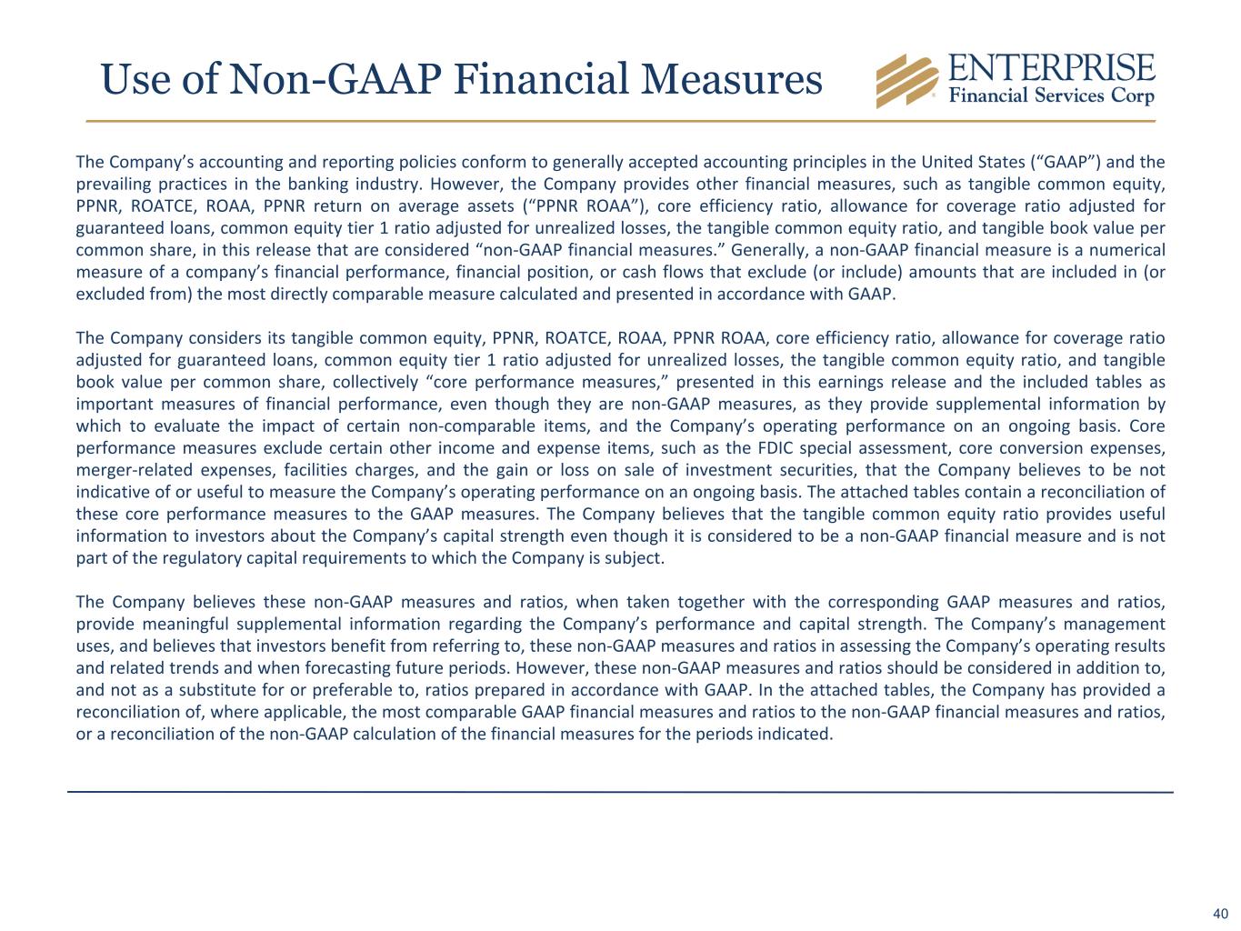Use of Non-GAAP Financial Measures The Company’s accounting and reporting policies conform to generally accepted accounting principles in the United States (“GAAP”) and the prevailing practices in the banking industry. However, the Company provides other financial measures, such as tangible common equity, PPNR, ROATCE, ROAA, PPNR return on average assets (“PPNR ROAA”), core efficiency ratio, allowance for coverage ratio adjusted for guaranteed loans, common equity tier 1 ratio adjusted for unrealized losses, the tangible common equity ratio, and tangible book value per common share, in this release that are considered “non-GAAP financial measures.” Generally, a non-GAAP financial measure is a numerical measure of a company’s financial performance, financial position, or cash flows that exclude (or include) amounts that are included in (or excluded from) the most directly comparable measure calculated and presented in accordance with GAAP. The Company considers its tangible common equity, PPNR, ROATCE, ROAA, PPNR ROAA, core efficiency ratio, allowance for coverage ratio adjusted for guaranteed loans, common equity tier 1 ratio adjusted for unrealized losses, the tangible common equity ratio, and tangible book value per common share, collectively “core performance measures,” presented in this earnings release and the included tables as important measures of financial performance, even though they are non-GAAP measures, as they provide supplemental information by which to evaluate the impact of certain non-comparable items, and the Company’s operating performance on an ongoing basis. Core performance measures exclude certain other income and expense items, such as the FDIC special assessment, core conversion expenses, merger-related expenses, facilities charges, and the gain or loss on sale of investment securities, that the Company believes to be not indicative of or useful to measure the Company’s operating performance on an ongoing basis. The attached tables contain a reconciliation of these core performance measures to the GAAP measures. The Company believes that the tangible common equity ratio provides useful information to investors about the Company’s capital strength even though it is considered to be a non-GAAP financial measure and is not part of the regulatory capital requirements to which the Company is subject. The Company believes these non-GAAP measures and ratios, when taken together with the corresponding GAAP measures and ratios, provide meaningful supplemental information regarding the Company’s performance and capital strength. The Company’s management uses, and believes that investors benefit from referring to, these non-GAAP measures and ratios in assessing the Company’s operating results and related trends and when forecasting future periods. However, these non-GAAP measures and ratios should be considered in addition to, and not as a substitute for or preferable to, ratios prepared in accordance with GAAP. In the attached tables, the Company has provided a reconciliation of, where applicable, the most comparable GAAP financial measures and ratios to the non-GAAP financial measures and ratios, or a reconciliation of the non-GAAP calculation of the financial measures for the periods indicated. 40
