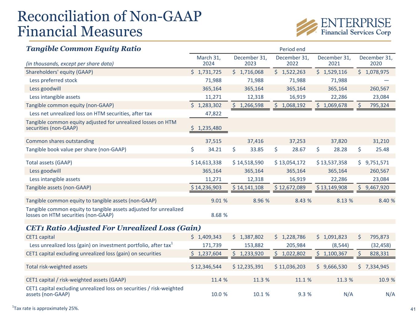 Reconciliation of Non-GAAP Financial Measures Tangible Common Equity Ratio Period end (in thousands, except per share data) March 31, 2024 December 31, 2023 December 31, 2022 December 31, 2021 December 31, 2020 Shareholders' equity (GAAP) $ 1,731,725 $ 1,716,068 $ 1,522,263 $ 1,529,116 $ 1,078,975 Less preferred stock 71,988 71,988 71,988 71,988 — Less goodwill 365,164 365,164 365,164 365,164 260,567 Less intangible assets 11,271 12,318 16,919 22,286 23,084 Tangible common equity (non-GAAP) $ 1,283,302 $ 1,266,598 $ 1,068,192 $ 1,069,678 $ 795,324 Less net unrealized loss on HTM securities, after tax 47,822 Tangible common equity adjusted for unrealized losses on HTM securities (non-GAAP) $ 1,235,480 Common shares outstanding 37,515 37,416 37,253 37,820 31,210 Tangible book value per share (non-GAAP) $ 34.21 $ 33.85 $ 28.67 $ 28.28 $ 25.48 Total assets (GAAP) $ 14,613,338 $ 14,518,590 $ 13,054,172 $ 13,537,358 $ 9,751,571 Less goodwill 365,164 365,164 365,164 365,164 260,567 Less intangible assets 11,271 12,318 16,919 22,286 23,084 Tangible assets (non-GAAP) $ 14,236,903 $ 14,141,108 $ 12,672,089 $ 13,149,908 $ 9,467,920 Tangible common equity to tangible assets (non-GAAP) 9.01 % 8.96 % 8.43 % 8.13 % 8.40 % Tangible common equity to tangible assets adjusted for unrealized losses on HTM securities (non-GAAP) 8.68 % CET1 Ratio Adjusted For Unrealized Loss (Gain) CET1 capital $ 1,409,343 $ 1,387,802 $ 1,228,786 $ 1,091,823 $ 795,873 Less unrealized loss (gain) on investment portfolio, after tax1 171,739 153,882 205,984 (8,544) (32,458) CET1 capital excluding unrealized loss (gain) on securities $ 1,237,604 $ 1,233,920 $ 1,022,802 $ 1,100,367 $ 828,331 Total risk-weighted assets $ 12,346,544 $ 12,235,391 $ 11,036,203 $ 9,666,530 $ 7,334,945 CET1 capital / risk-weighted assets (GAAP) 11.4 % 11.3 % 11.1 % 11.3 % 10.9 % CET1 capital excluding unrealized loss on securities / risk-weighted assets (non-GAAP) 10.0 % 10.1 % 9.3 % N/A N/A 1Tax rate is approximately 25%. 41