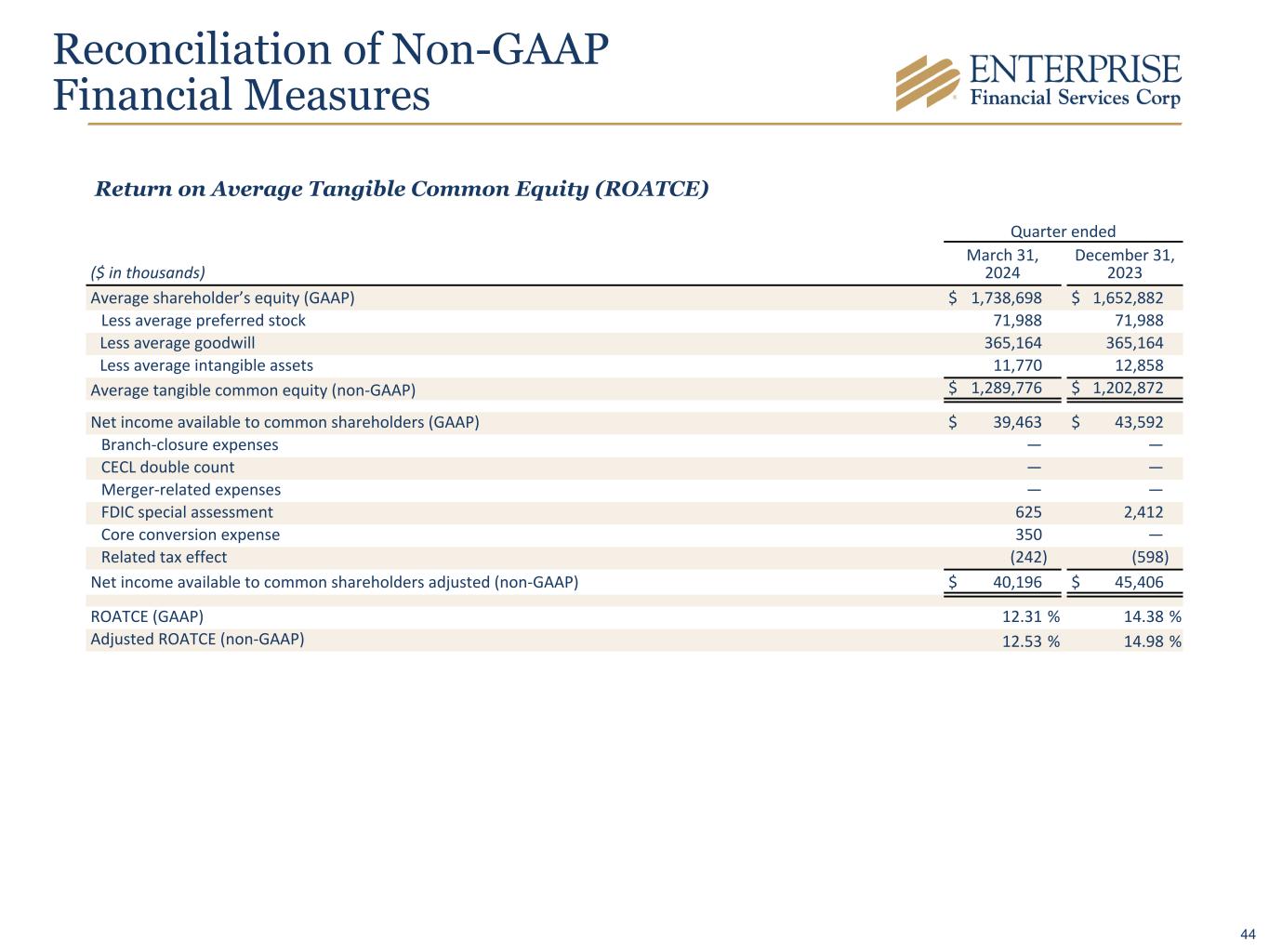 Quarter ended ($ in thousands) March 31, 2024 December 31, 2023 Average shareholder’s equity (GAAP) $ 1,738,698 $ 1,652,882 Less average preferred stock 71,988 71,988 Less average goodwill 365,164 365,164 Less average intangible assets 11,770 12,858 Average tangible common equity (non-GAAP) $ 1,289,776 $ 1,202,872 Net income available to common shareholders (GAAP) $ 39,463 $ 43,592 Branch-closure expenses — — CECL double count — — Merger-related expenses — — FDIC special assessment 625 2,412 Core conversion expense 350 — Related tax effect (242) (598) Net income available to common shareholders adjusted (non-GAAP) $ 40,196 $ 45,406 ROATCE (GAAP) 12.31 % 14.38 % Adjusted ROATCE (non-GAAP) 12.53 % 14.98 % Reconciliation of Non-GAAP Financial Measures Return on Average Tangible Common Equity (ROATCE) 44