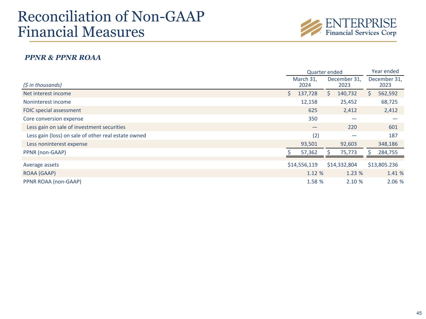 Quarter ended Year ended ($ in thousands) March 31, 2024 December 31, 2023 December 31, 2023 Net interest income $ 137,728 $ 140,732 $ 562,592 Noninterest income 12,158 25,452 68,725 FDIC special assessment 625 2,412 2,412 Core conversion expense 350 — — Less gain on sale of investment securities — 220 601 Less gain (loss) on sale of other real estate owned (2) — 187 Less noninterest expense 93,501 92,603 348,186 PPNR (non-GAAP) $ 57,362 $ 75,773 $ 284,755 Average assets $ 14,556,119 $ 14,332,804 $ 13,805.236 ROAA (GAAP) 1.12 % 1.23 % 1.41 % PPNR ROAA (non-GAAP) 1.58 % 2.10 % 2.06 % PPNR & PPNR ROAA Reconciliation of Non-GAAP Financial Measures 45