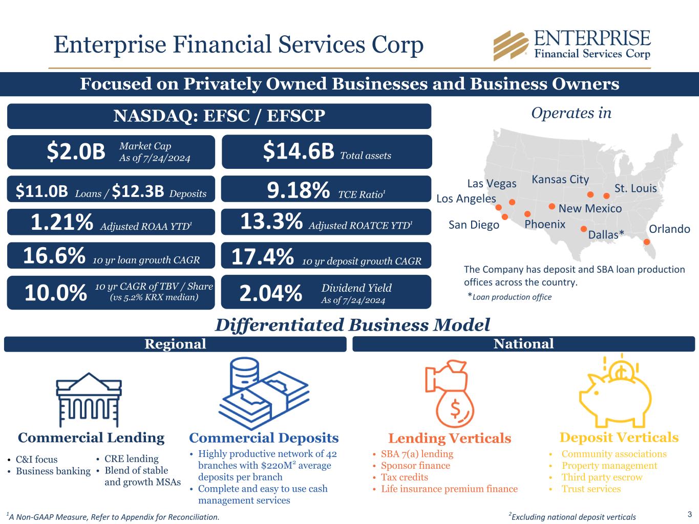 Enterprise Financial Services Corp Operates in St. Louis Kansas City Phoenix New Mexico Los Angeles Las Vegas The Company has deposit and SBA loan production offices across the country. San Diego Dallas* Orlando Focused on Privately Owned Businesses and Business Owners Commercial Lending Lending Verticals Deposit VerticalsCommercial Deposits • C&I focus • Business banking • CRE lending • Blend of stable and growth MSAs • SBA 7(a) lending • Sponsor finance • Tax credits • Life insurance premium finance • Community associations • Property management • Third party escrow • Trust services • Highly productive network of 42 branches with $220M2 average deposits per branch • Complete and easy to use cash management services NASDAQ: EFSC / EFSCP $2.0B r $14.6B Total assets $11.0B Loans / $12.3B Deposits 9.18% TCE Ratio1 1.21% Adjusted ROAA YTD1 13.3% Adjusted ROATCE YTD1 10.0% r 2.04% r Differentiated Business Model Market Cap As of 7/24/2024 1A Non-GAAP Measure, Refer to Appendix for Reconciliation. 10 yr CAGR of TBV / Share (vs 5.2% KRX median) Dividend Yield As of 7/24/2024 16.6% 10 yr loan growth CAGR 17.4% 10 yr deposit growth CAGR *Loan production office Regional National 2Excluding national deposit verticals 3