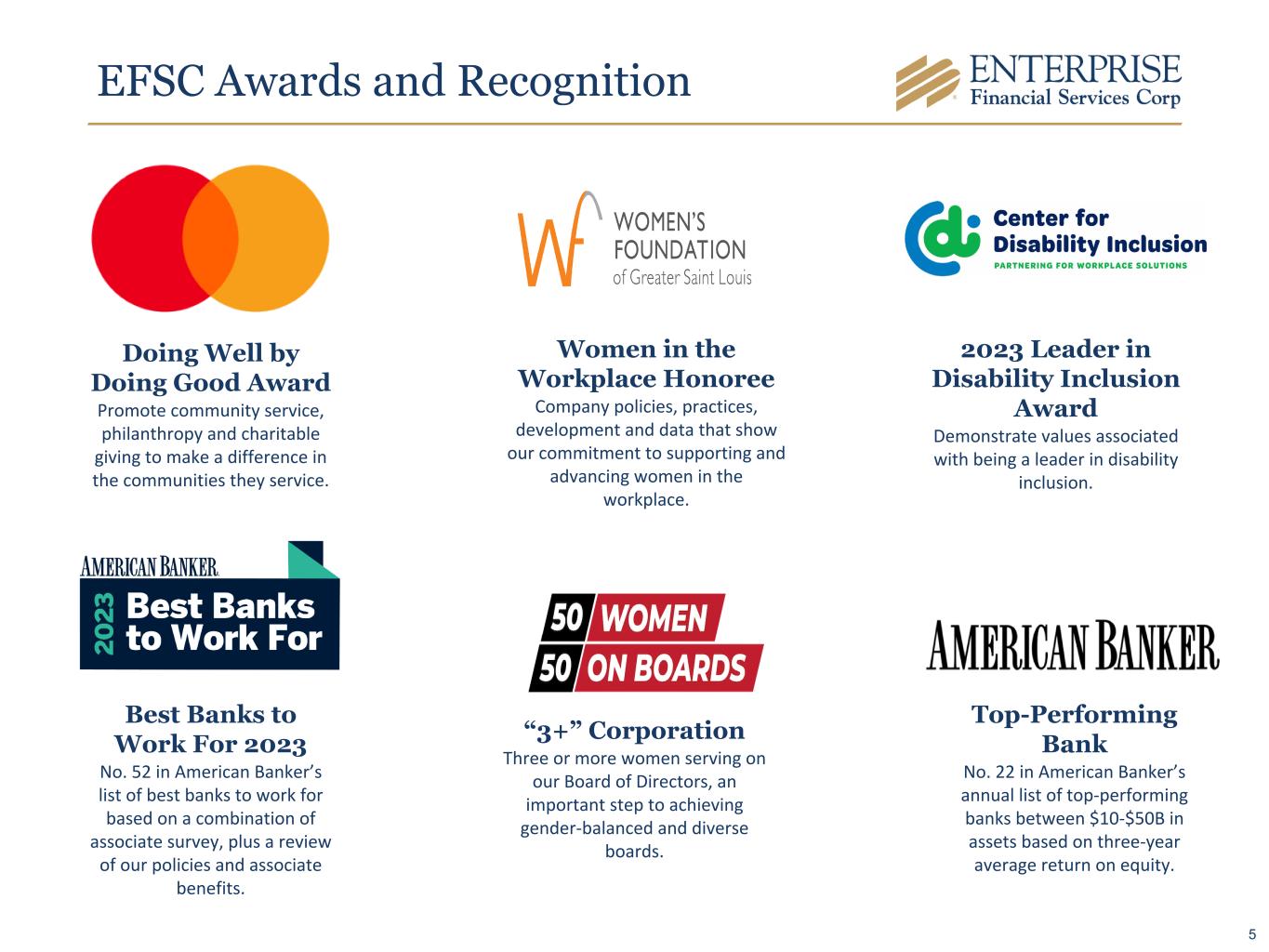 EFSC Awards and Recognition Doing Well by Doing Good Award Promote community service, philanthropy and charitable giving to make a difference in the communities they service. Women in the Workplace Honoree Company policies, practices, development and data that show our commitment to supporting and advancing women in the workplace. “3+” Corporation Three or more women serving on our Board of Directors, an important step to achieving gender-balanced and diverse boards. 2023 Leader in Disability Inclusion Award Demonstrate values associated with being a leader in disability inclusion. Top-Performing Bank No. 22 in American Banker’s annual list of top-performing banks between $10-$50B in assets based on three-year average return on equity. Best Banks to Work For 2023 No. 52 in American Banker’s list of best banks to work for based on a combination of associate survey, plus a review of our policies and associate benefits. 5