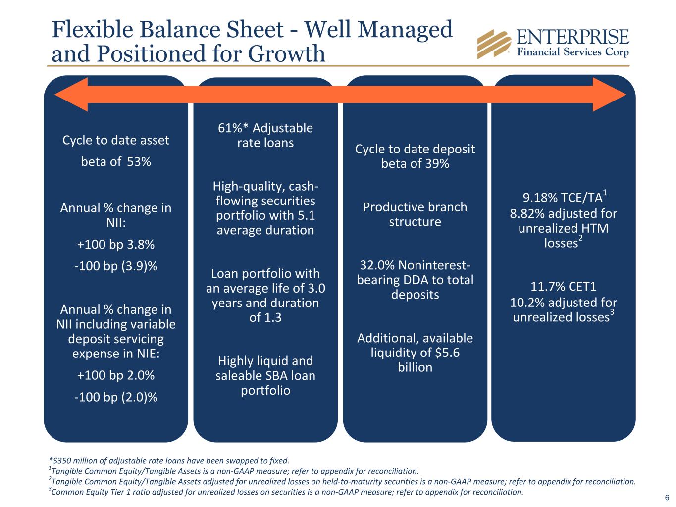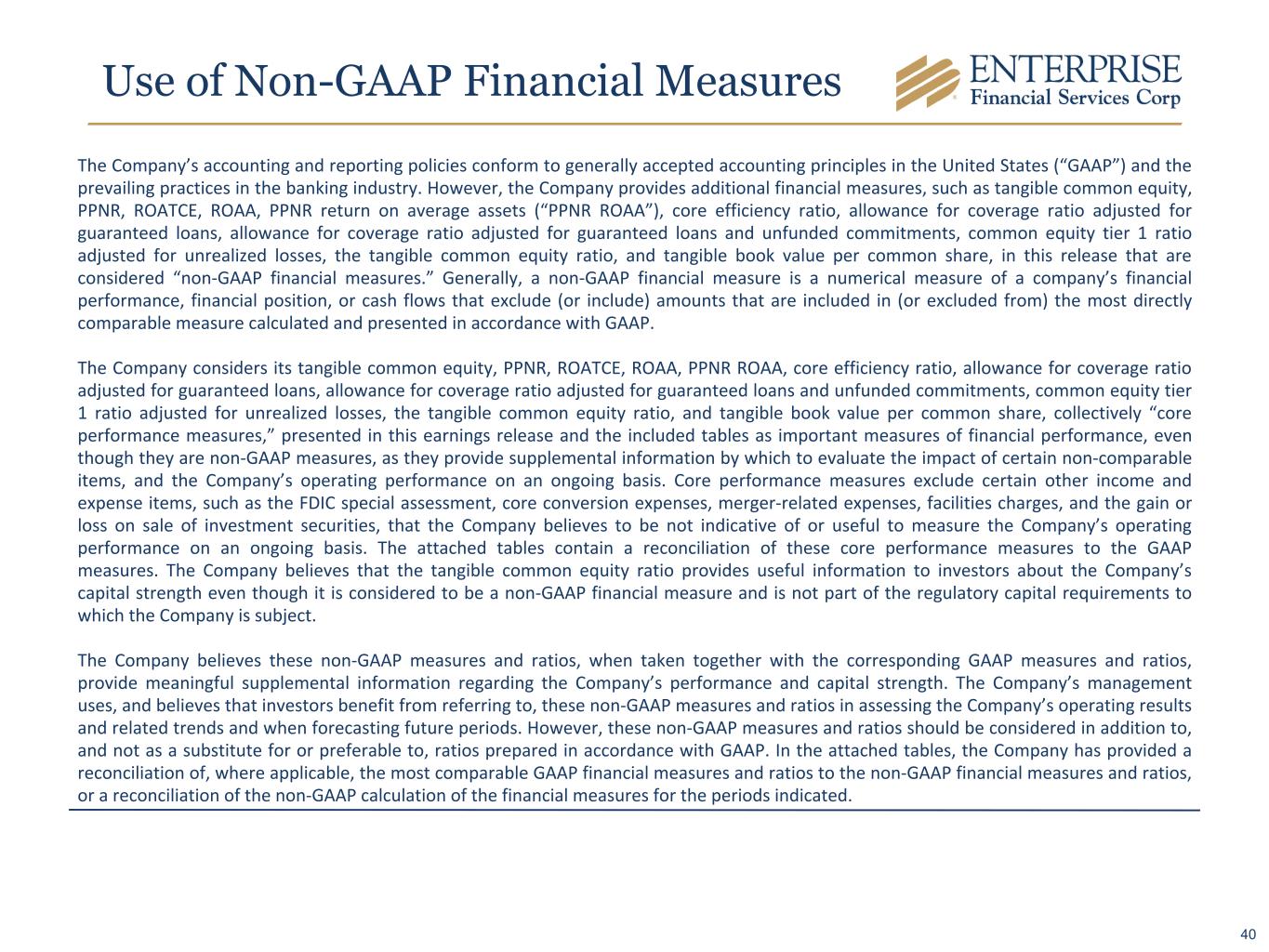 Use of Non-GAAP Financial Measures The Company’s accounting and reporting policies conform to generally accepted accounting principles in the United States (“GAAP”) and the prevailing practices in the banking industry. However, the Company provides additional financial measures, such as tangible common equity, PPNR, ROATCE, ROAA, PPNR return on average assets (“PPNR ROAA”), core efficiency ratio, allowance for coverage ratio adjusted for guaranteed loans, allowance for coverage ratio adjusted for guaranteed loans and unfunded commitments, common equity tier 1 ratio adjusted for unrealized losses, the tangible common equity ratio, and tangible book value per common share, in this release that are considered “non-GAAP financial measures.” Generally, a non-GAAP financial measure is a numerical measure of a company’s financial performance, financial position, or cash flows that exclude (or include) amounts that are included in (or excluded from) the most directly comparable measure calculated and presented in accordance with GAAP. The Company considers its tangible common equity, PPNR, ROATCE, ROAA, PPNR ROAA, core efficiency ratio, allowance for coverage ratio adjusted for guaranteed loans, allowance for coverage ratio adjusted for guaranteed loans and unfunded commitments, common equity tier 1 ratio adjusted for unrealized losses, the tangible common equity ratio, and tangible book value per common share, collectively “core performance measures,” presented in this earnings release and the included tables as important measures of financial performance, even though they are non-GAAP measures, as they provide supplemental information by which to evaluate the impact of certain non-comparable items, and the Company’s operating performance on an ongoing basis. Core performance measures exclude certain other income and expense items, such as the FDIC special assessment, core conversion expenses, merger-related expenses, facilities charges, and the gain or loss on sale of investment securities, that the Company believes to be not indicative of or useful to measure the Company’s operating performance on an ongoing basis. The attached tables contain a reconciliation of these core performance measures to the GAAP measures. The Company believes that the tangible common equity ratio provides useful information to investors about the Company’s capital strength even though it is considered to be a non-GAAP financial measure and is not part of the regulatory capital requirements to which the Company is subject. The Company believes these non-GAAP measures and ratios, when taken together with the corresponding GAAP measures and ratios, provide meaningful supplemental information regarding the Company’s performance and capital strength. The Company’s management uses, and believes that investors benefit from referring to, these non-GAAP measures and ratios in assessing the Company’s operating results and related trends and when forecasting future periods. However, these non-GAAP measures and ratios should be considered in addition to, and not as a substitute for or preferable to, ratios prepared in accordance with GAAP. In the attached tables, the Company has provided a reconciliation of, where applicable, the most comparable GAAP financial measures and ratios to the non-GAAP financial measures and ratios, or a reconciliation of the non-GAAP calculation of the financial measures for the periods indicated. 40